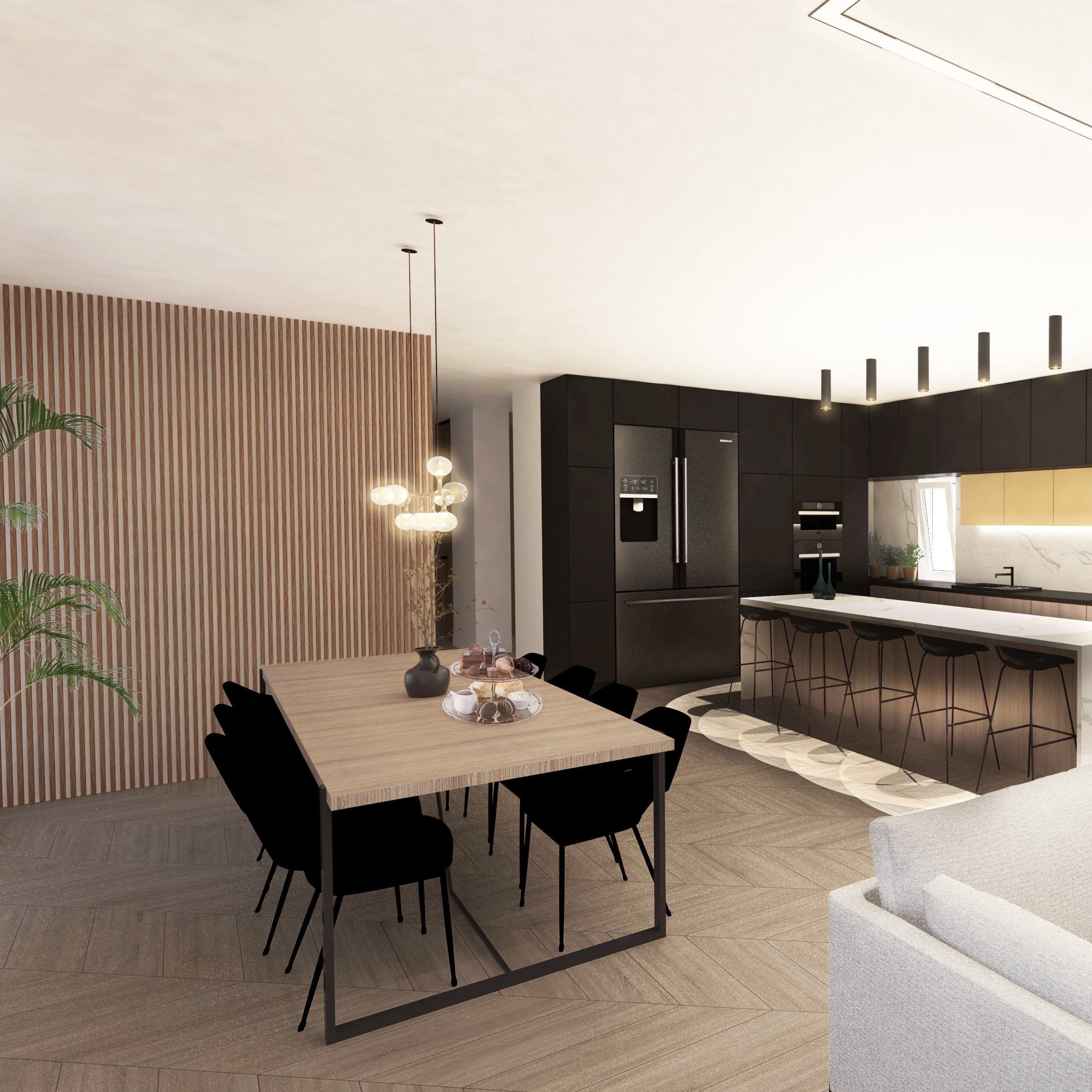 This open-plan dining area is accentuated by pendant lighting and contemporary furniture. The custom kitchen island with integrated wine storage provides a practical and stylish touch.