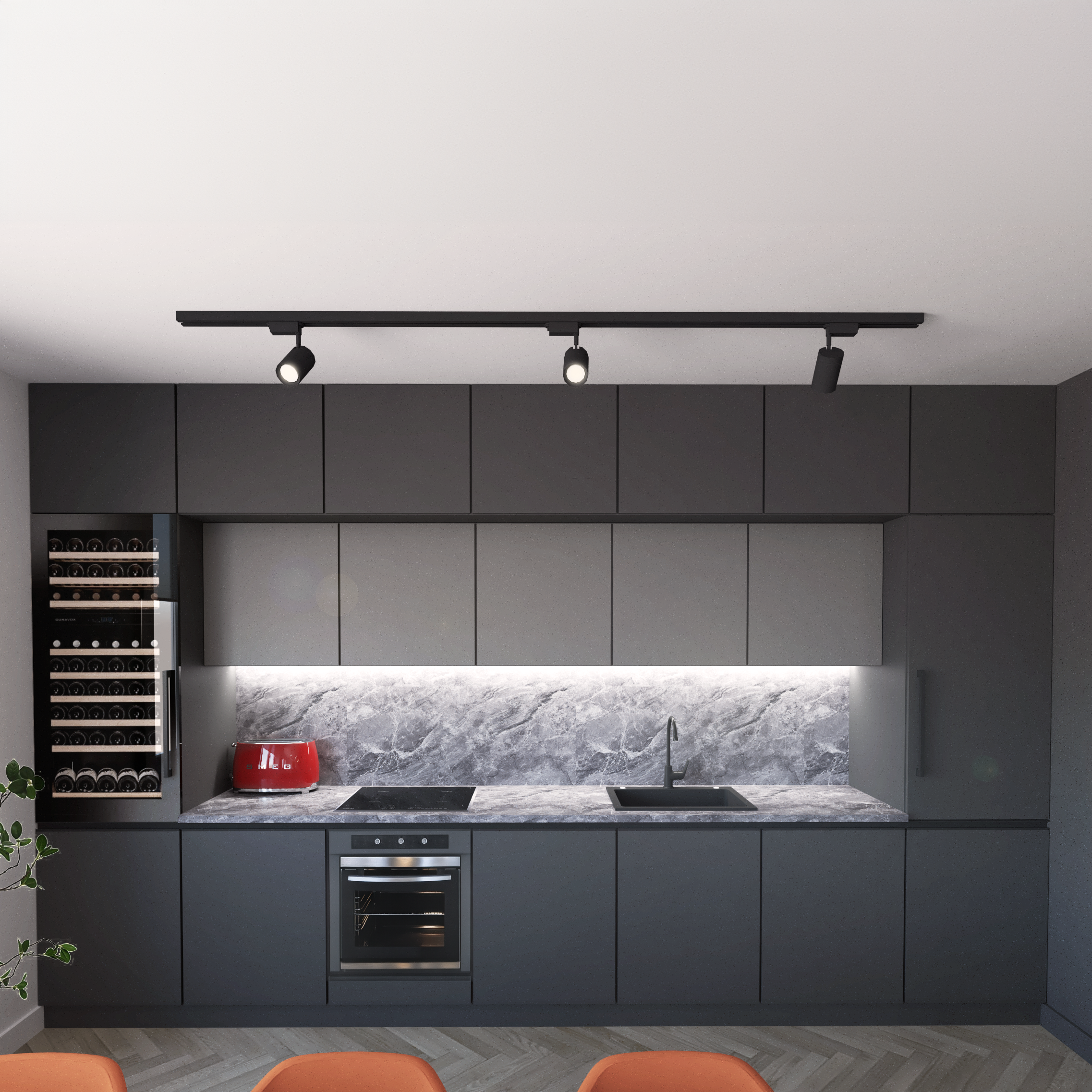 The kitchen showcases dark cabinetry complemented by a striking marble backsplash, with a vibrant red, bold accents and large wine cooler. Modern track lighting highlights the clean lines, making this space ideal for both cooking and socializing, with an eye-catching balance of color and form.