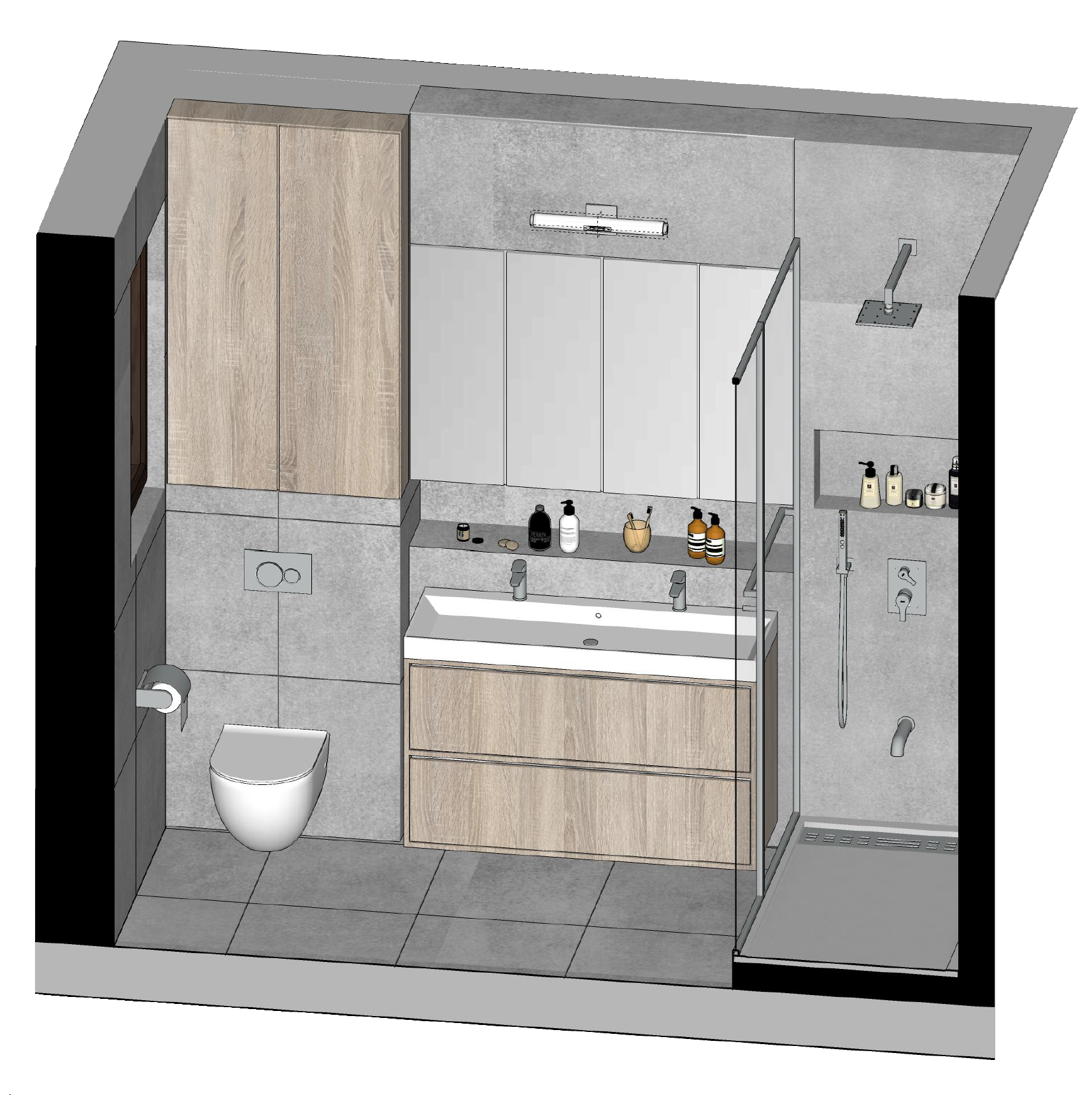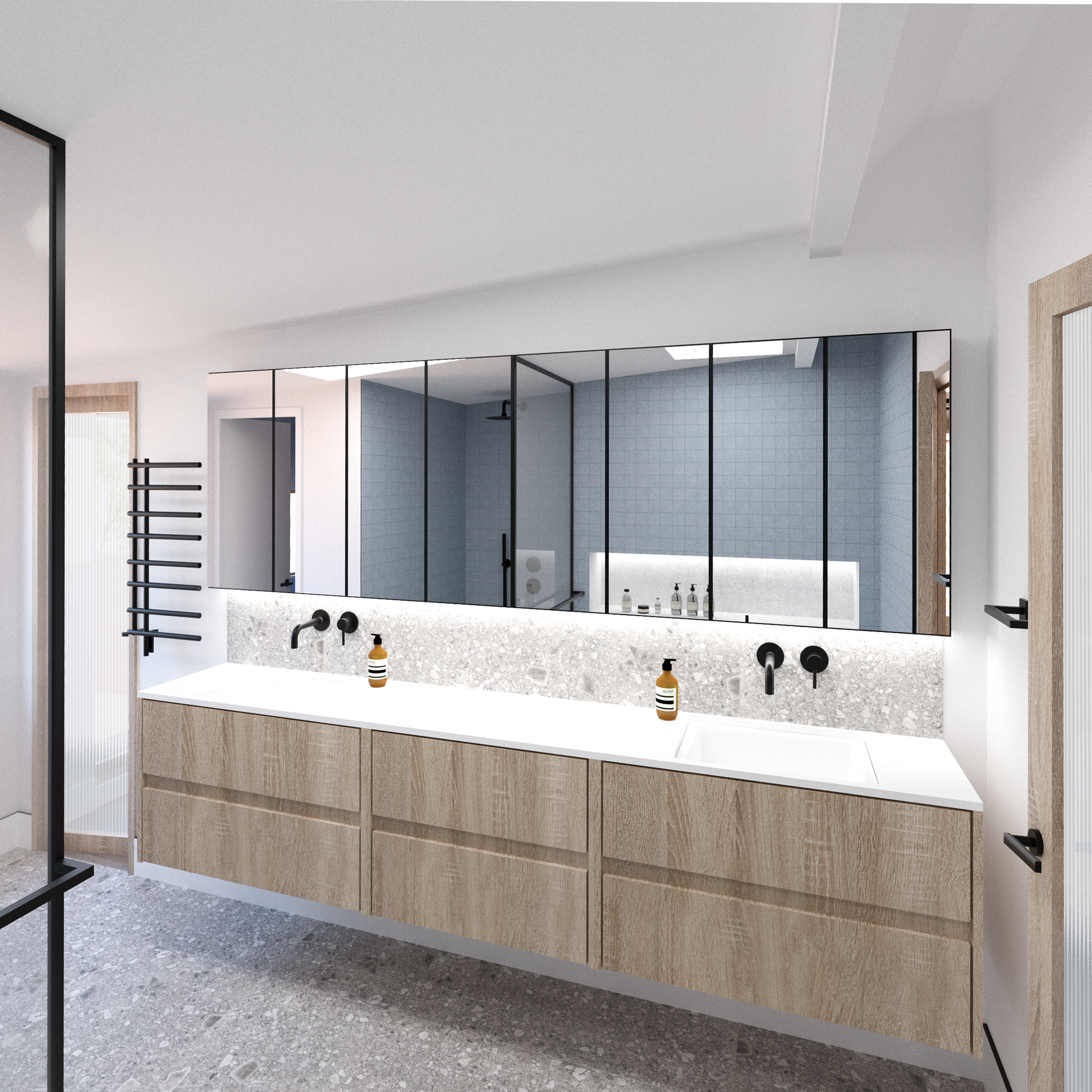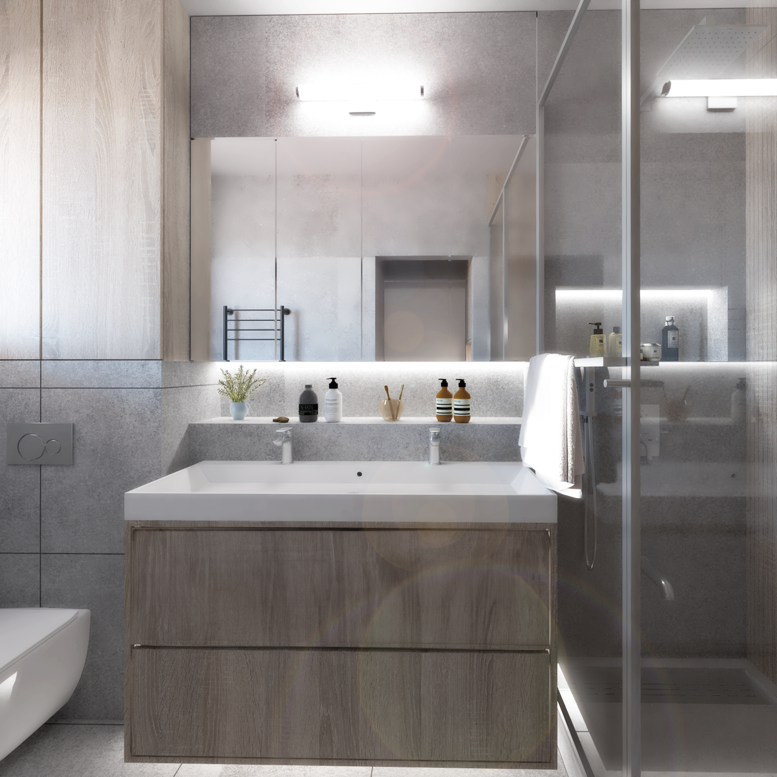 This modern bathroom features natural wood cabinetry paired with grey tiles. The integrated mirror and lighting create a streamlined look, while ample storage and a clean design make the space both functional and inviting.