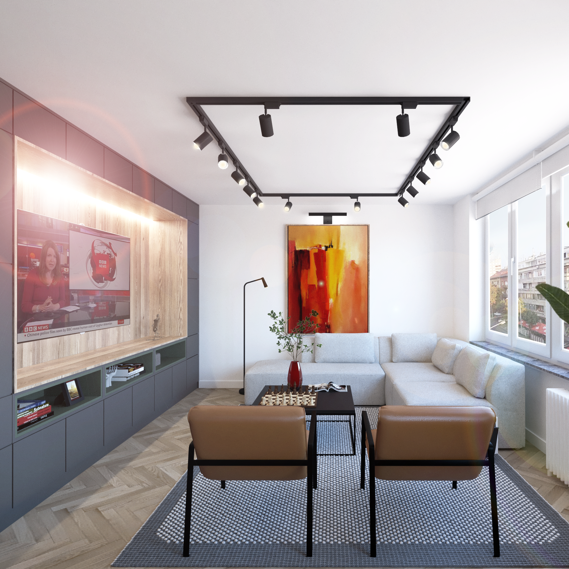 The living area features built-in cabinetry with a combination of light wood and dark matte finishes. Track lighting enhances the contemporary feel of the room, while the neutral furniture creates a comfortable space perfect for relaxation or entertainment. The bold red art piece creates a visual focus for the room.