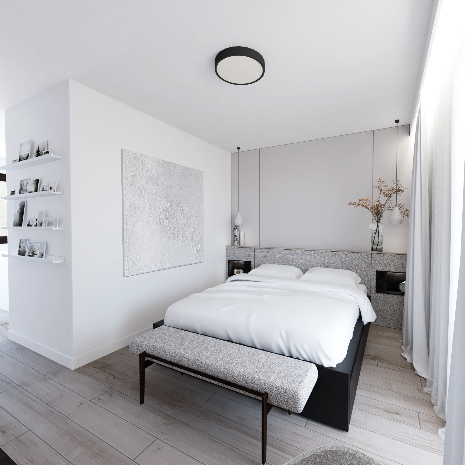 A bright and airy bedroom with a soft color palette and simple furnishings. The white walls and light wood flooring create a calming, serene environment, perfect for relaxation.