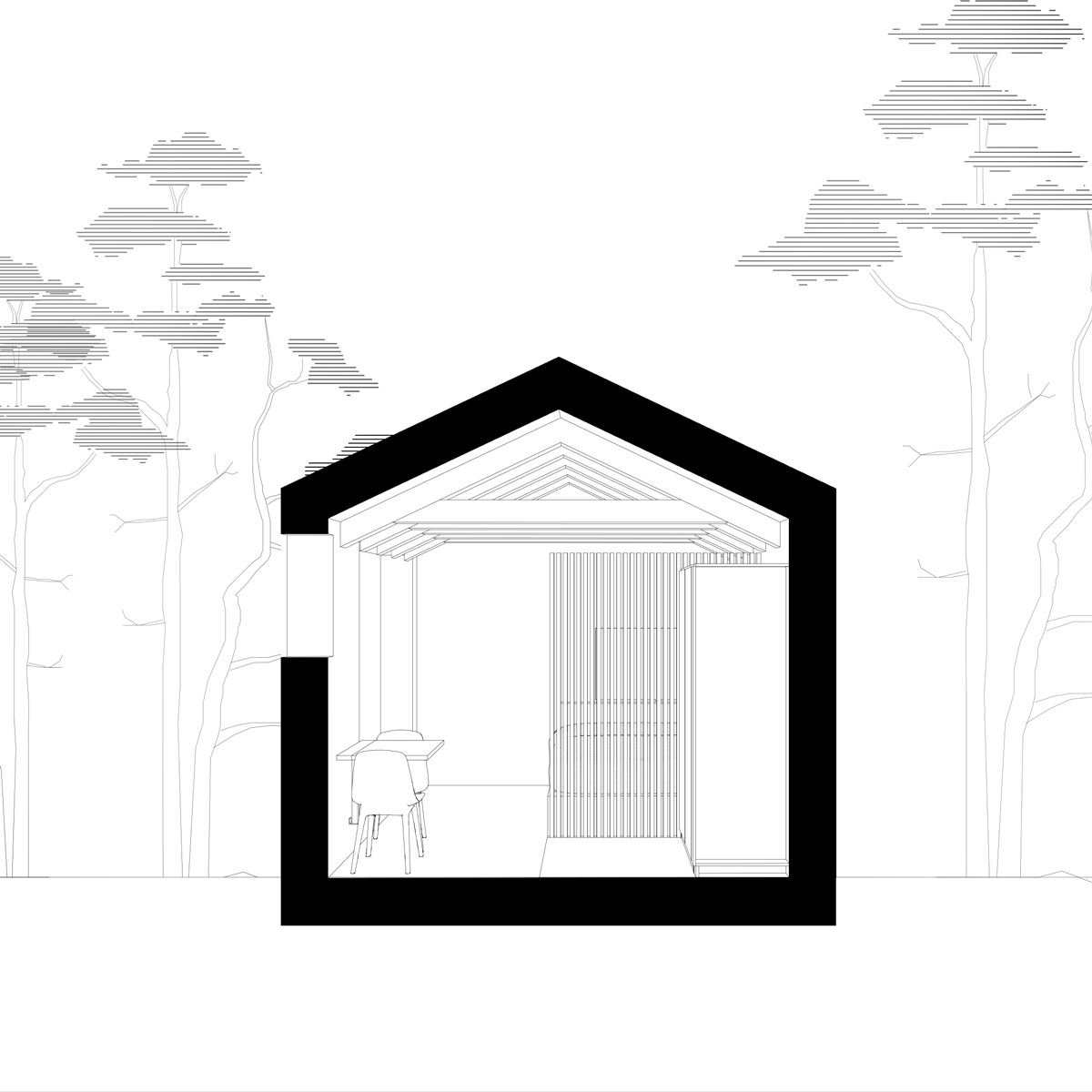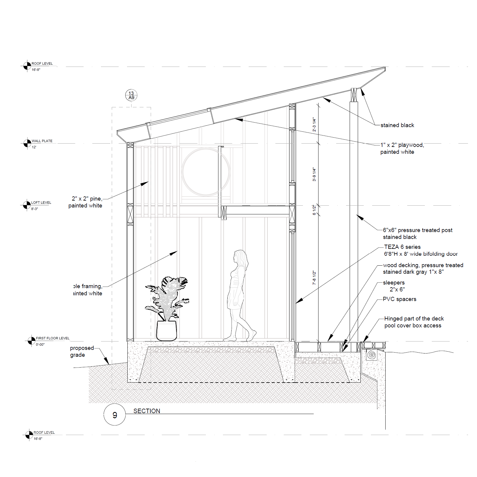 Detailed architectural section showcasing the pool house’s structure. The design highlights the use of pressure-treated wood for durability, with thoughtful features such as a hinged deck section for pool cover access.