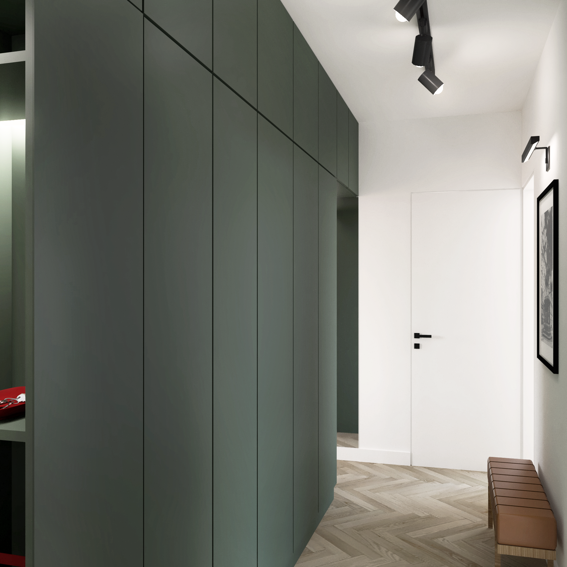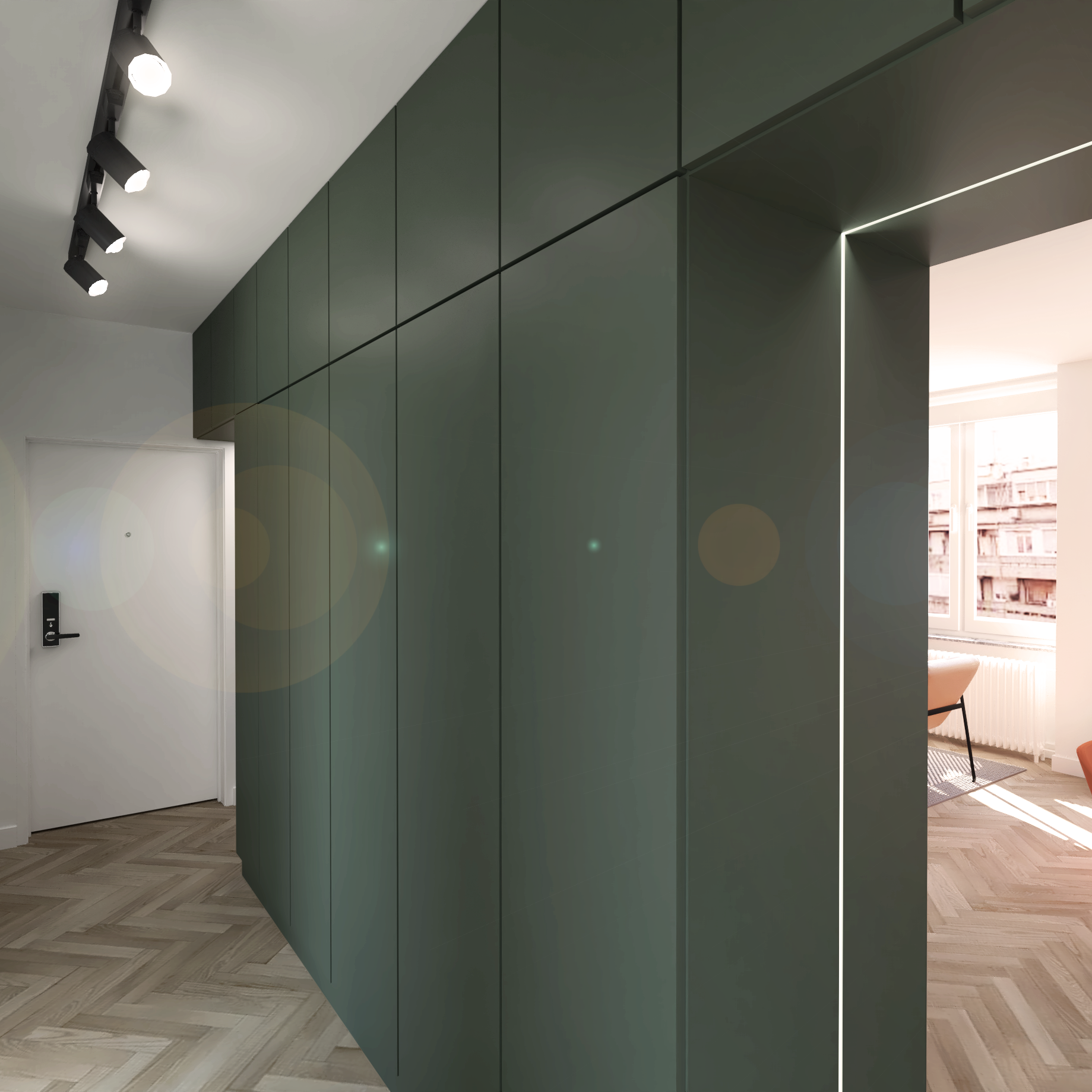 The hallway features seamless cabinetry in a calming green, with integrated lighting that subtly highlights the clean lines of the space. The minimalistic aesthetic is perfect for maximizing storage without compromising on style.