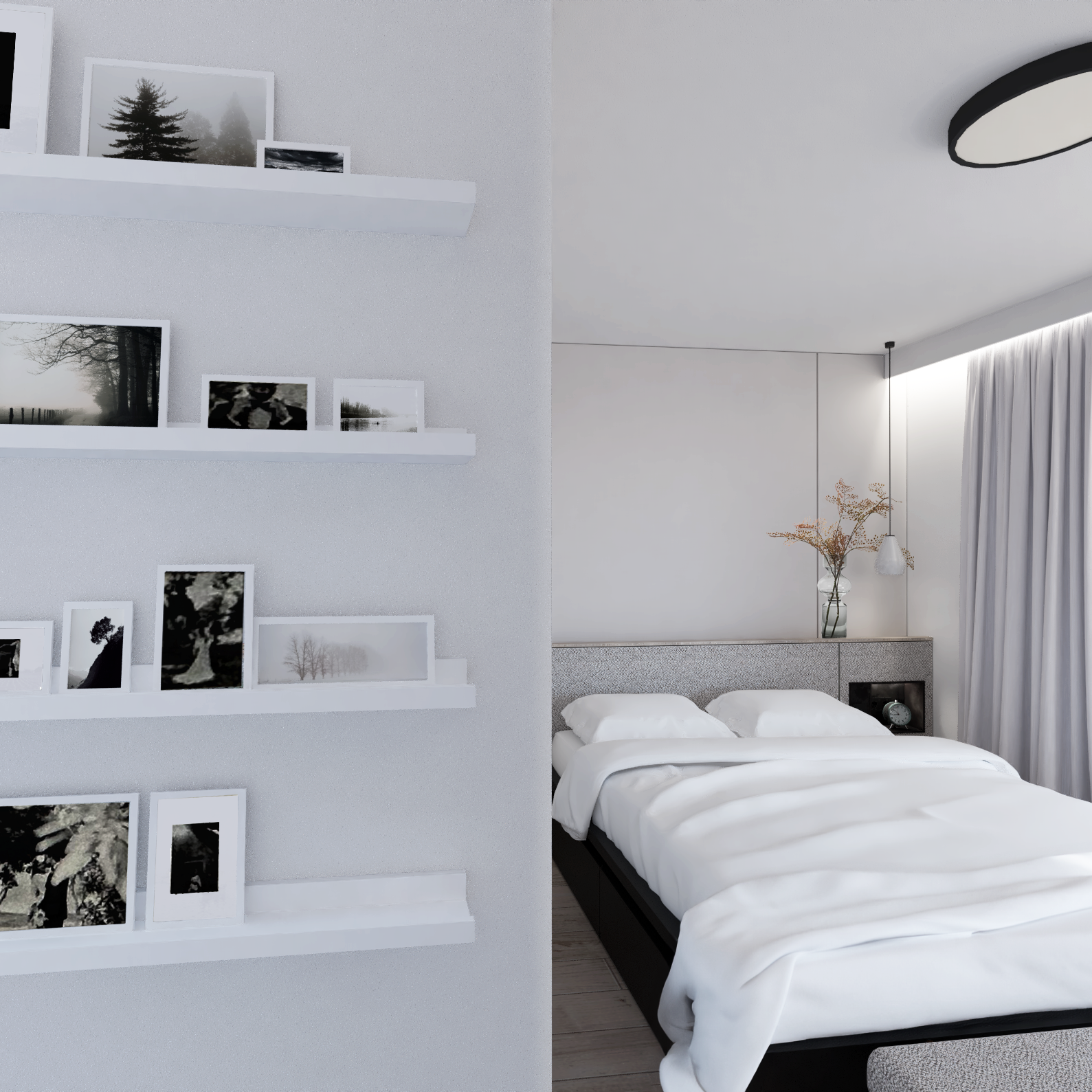 Floating shelves offer a subtle, modern way to display personal photos and artwork, adding a personal touch to the clean, contemporary design of this bedroom