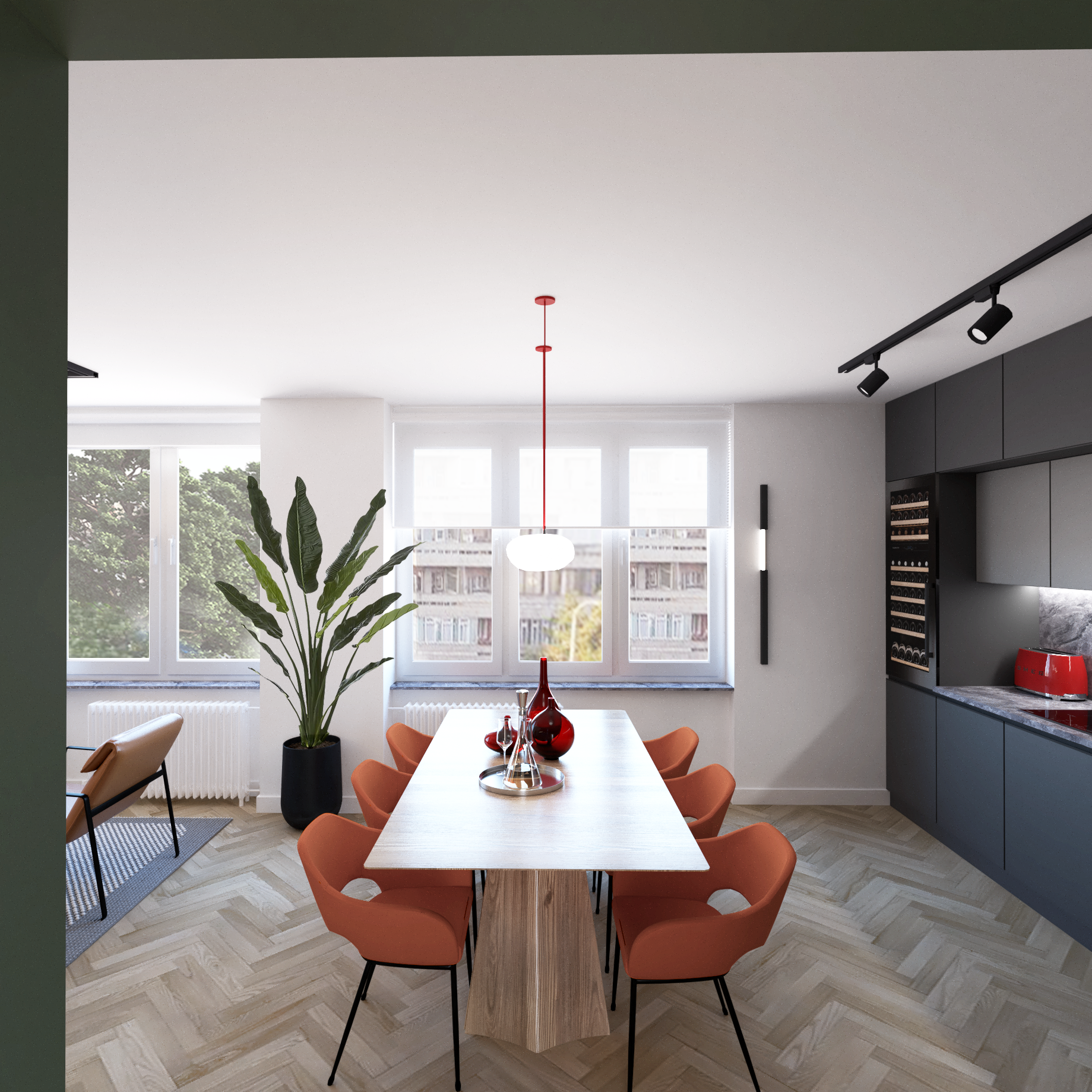 The dining area stands out with its bold orange chairs and minimalist wooden table, creating a lively contrast against the neutral background. The red pendant light draws attention to the center of the space, blending modern design with warmth for an inviting atmosphere, perfect for gatherings.