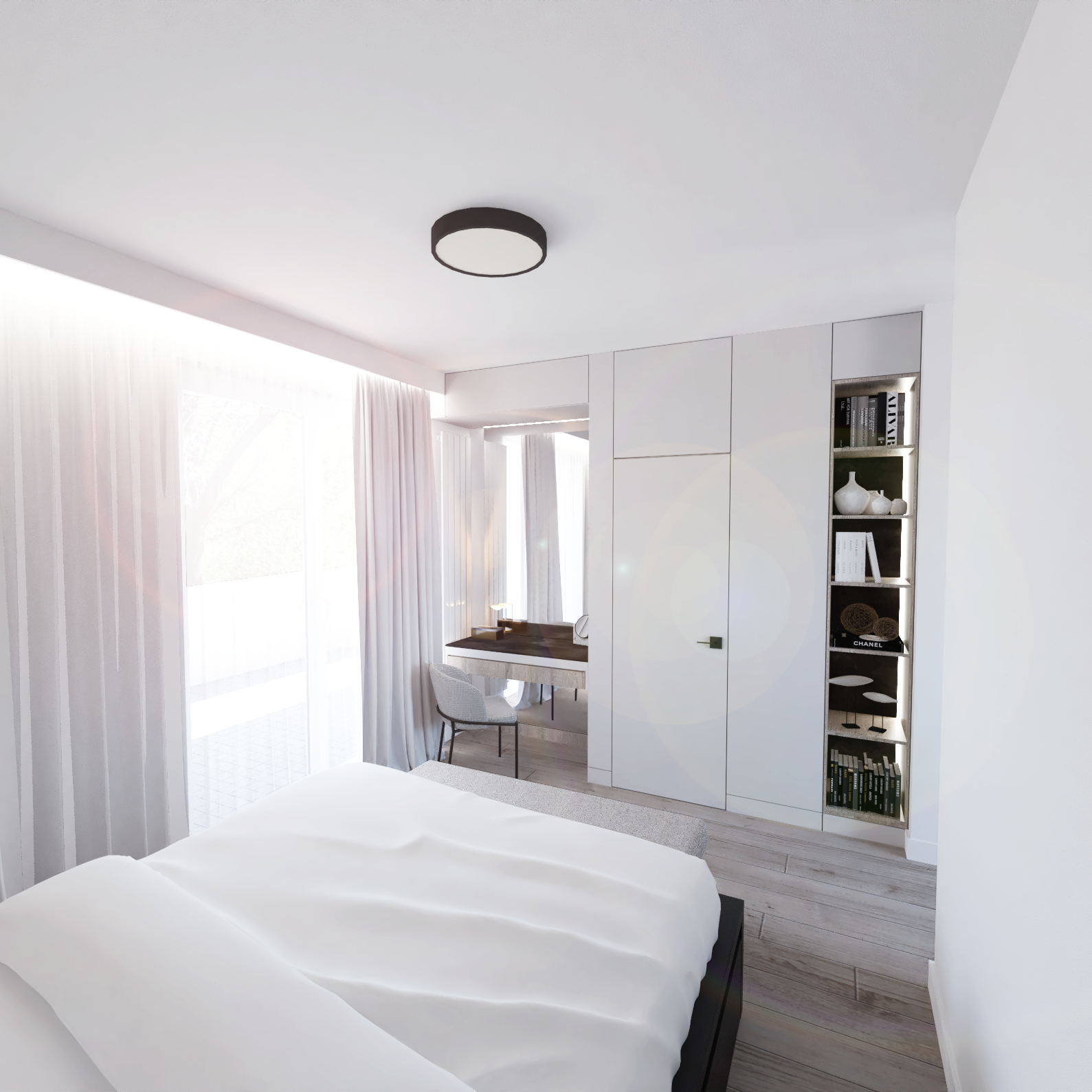 This bright bedroom features soft neutrals and natural light, creating a peaceful and serene atmosphere. The built-in storage and make-up vanity make the most of the compact layout, offering both functionality and style.
