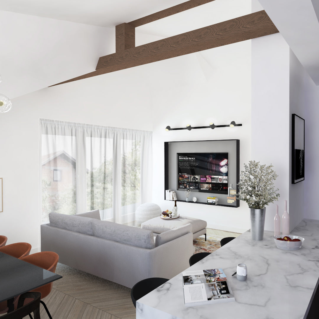 Open space living room, dining, and kitchen design. We opted for leaving the natural wood beams revealed to add more warmth to the space. The slope of the roof adds dynamics to the space.