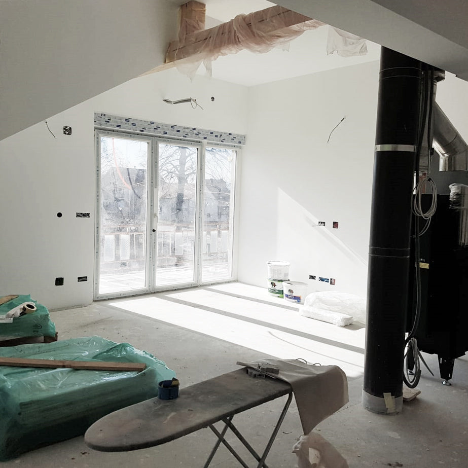 At the construction site. When the design enters reality. Walls, plumbing, electrical in place, floors on the way. Our specially designed fireplace is just being installed.
