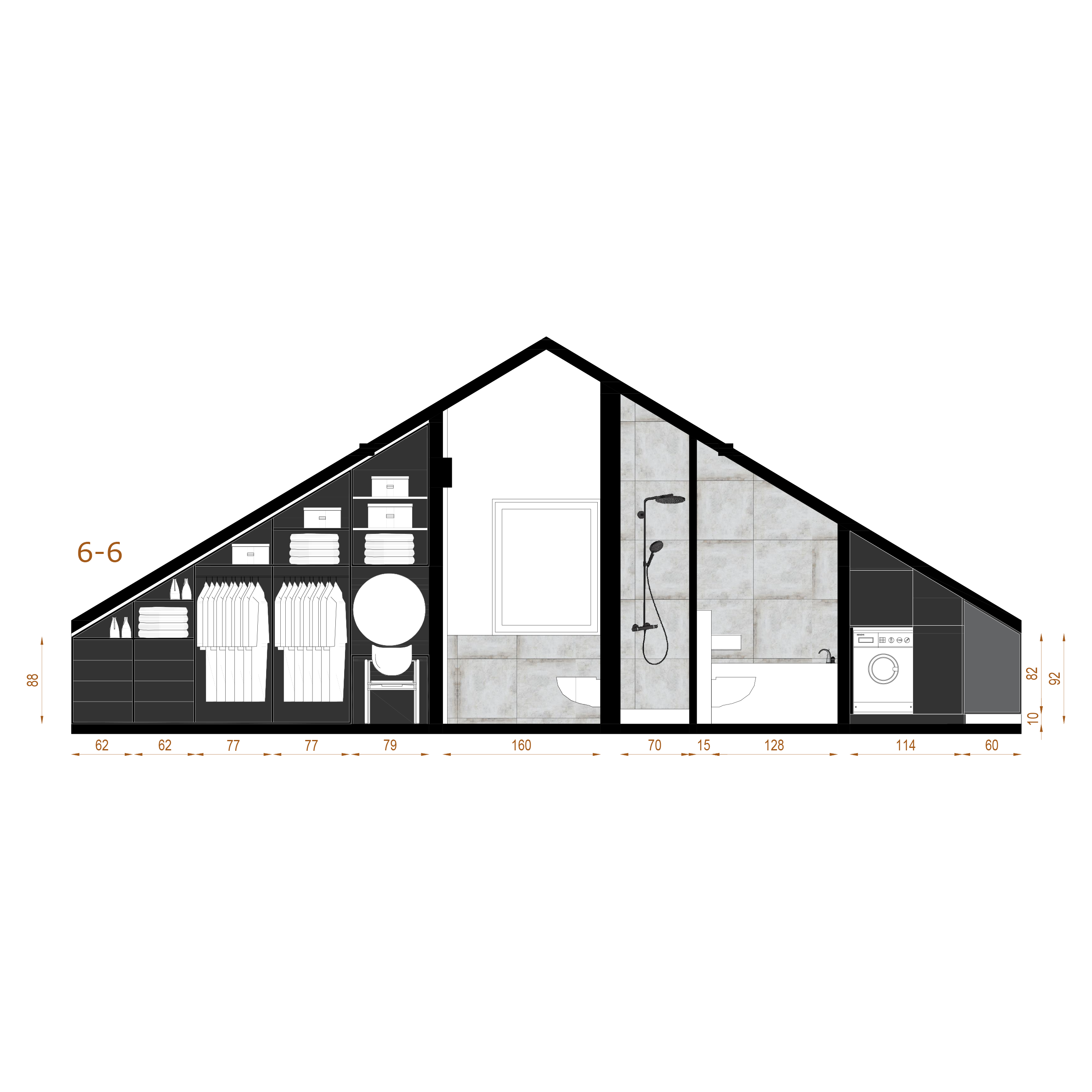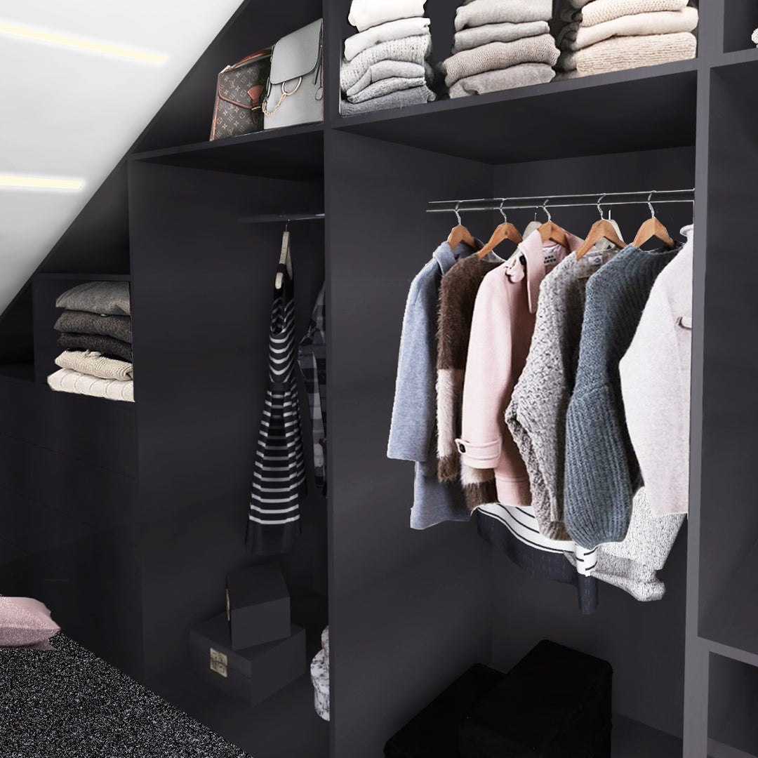 We added a walk-in closet to our client's brief. They loved it! The area under the sloped roof is utilized to its maximum. The strip lighting and black millwork make it look like a boutique