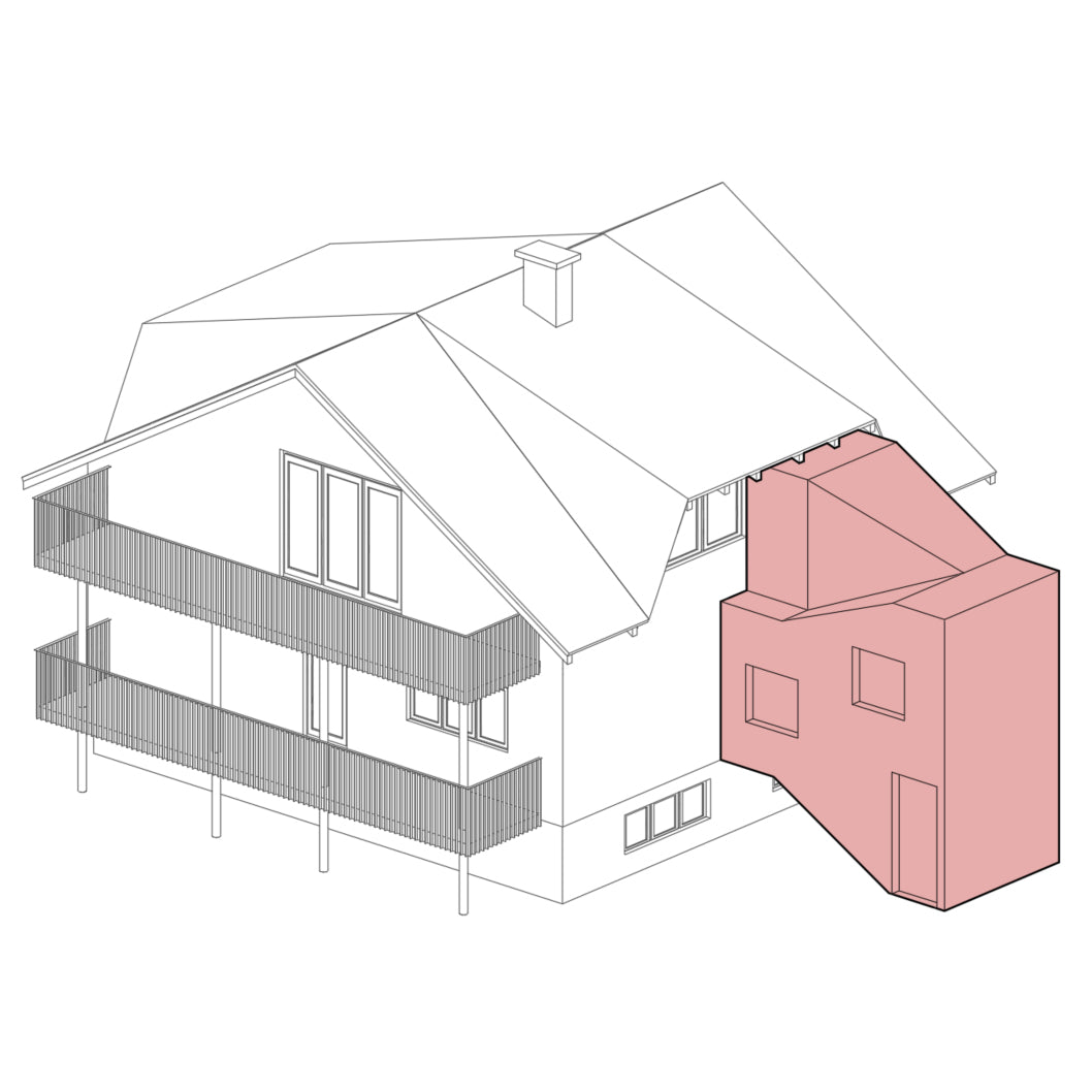 The stair volume addition - a new entrance and staircase connect two stories of an existing house, creating more space in the interior.