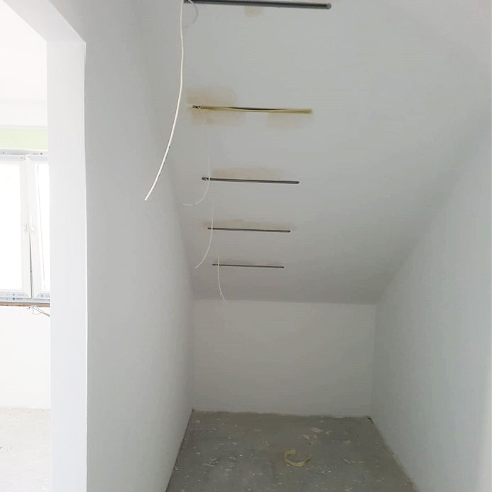 The walk-in closet is being built. The strip lighting recesses are in. Next step, floors and custom millwork. The closet also has a built-in makeup table.