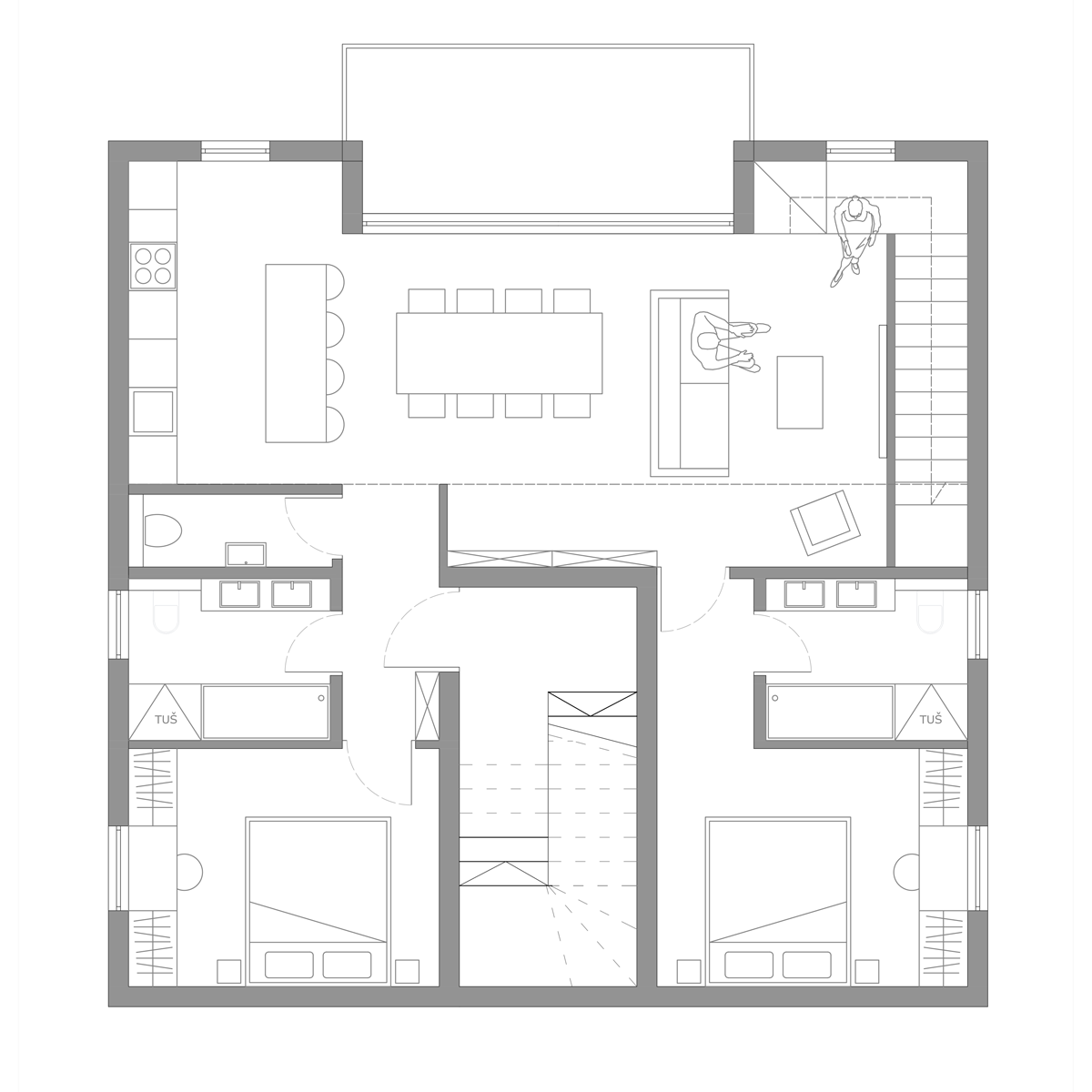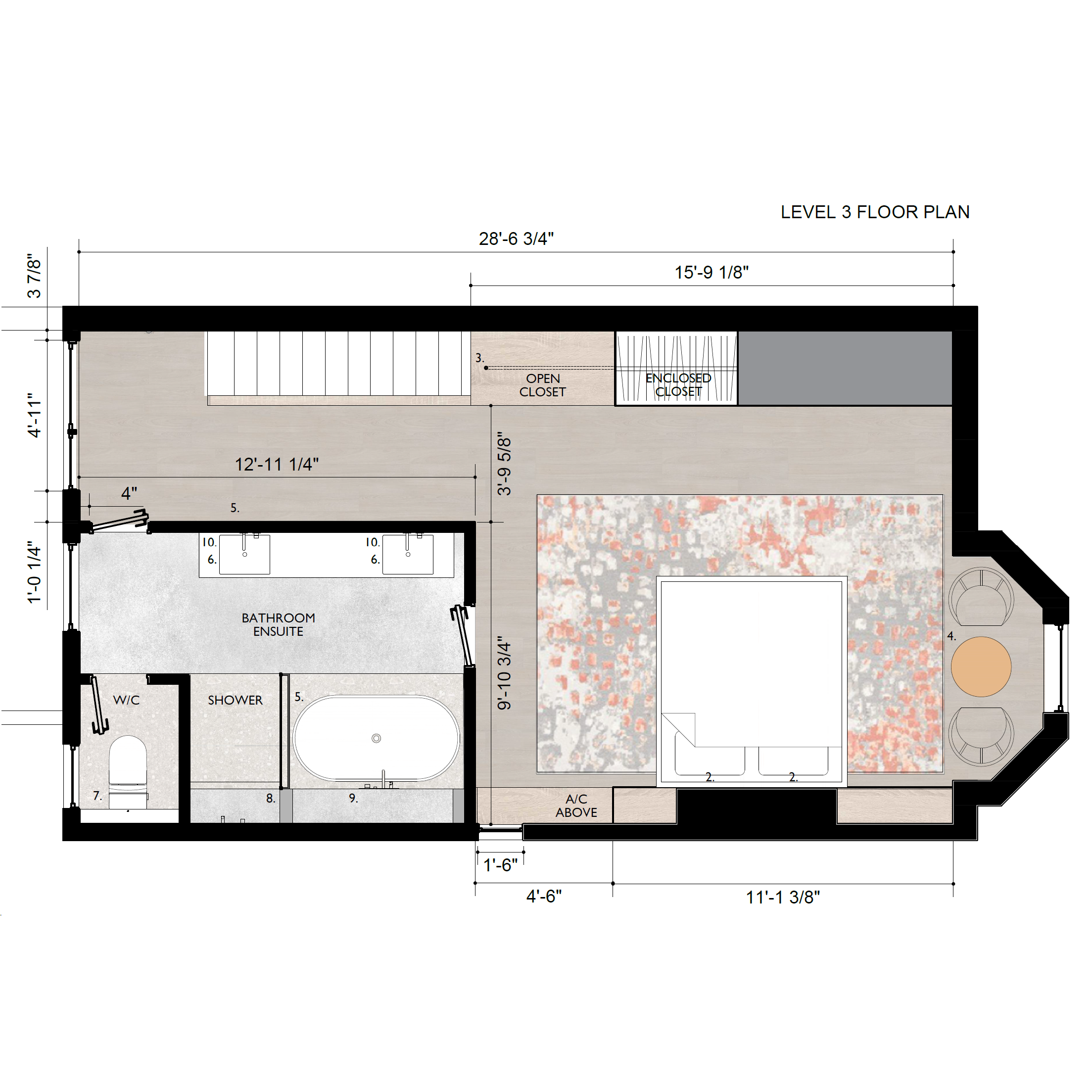 In partnership with Justin Loucks Architecture . Detailed floor plan of SPL House's third level, showcasing the layout of the main bedroom and ensuite bathroom. The design optimizes space and flow, with an open closet and integrated seating area.