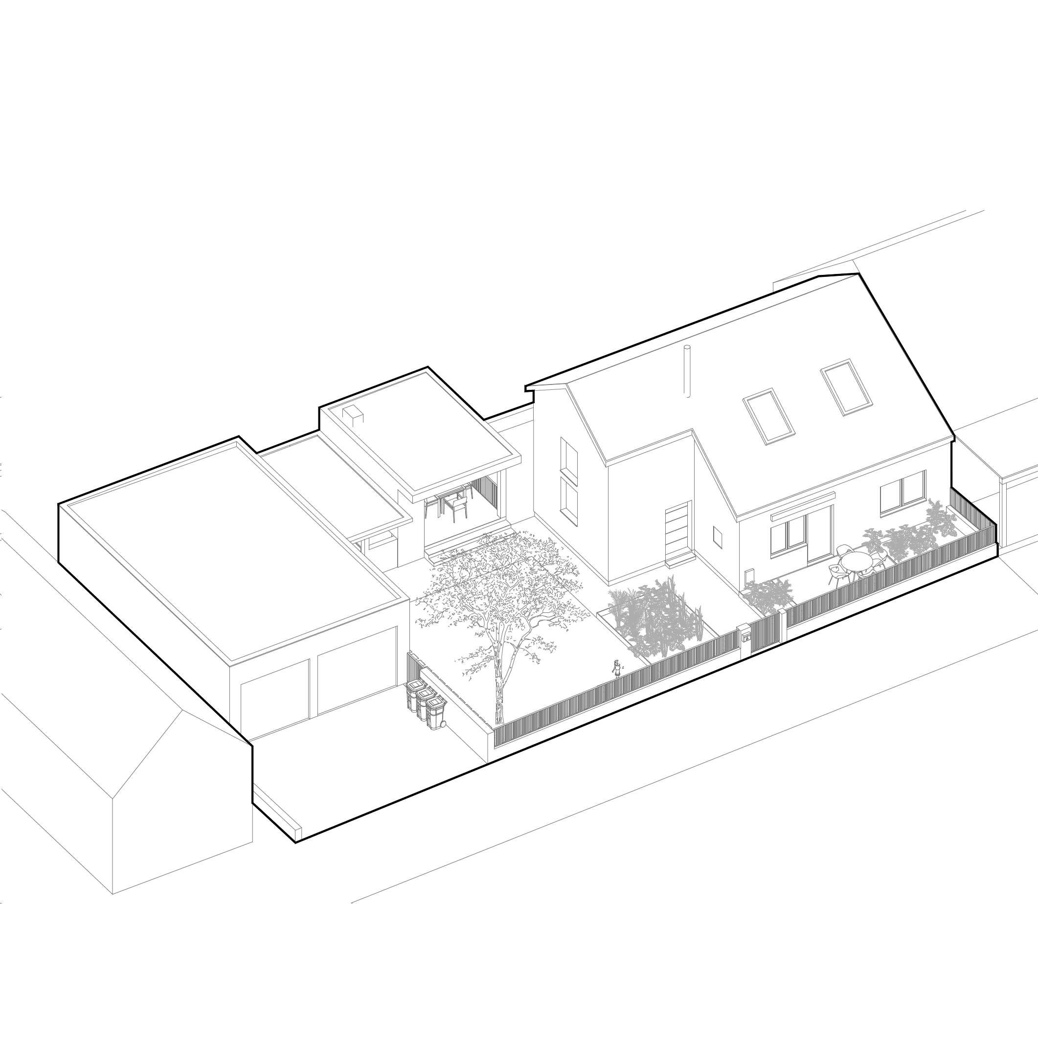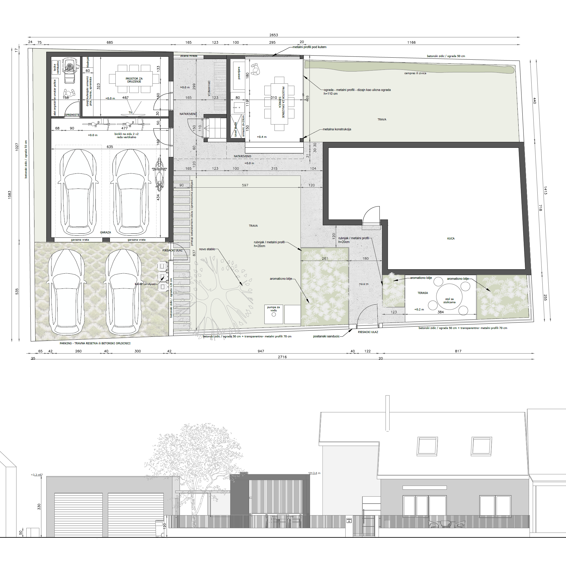 Plans for the G House lot showcasing the garage, living areas, and garden layout. Seamlessly integrating indoor and outdoor garden spaces.
