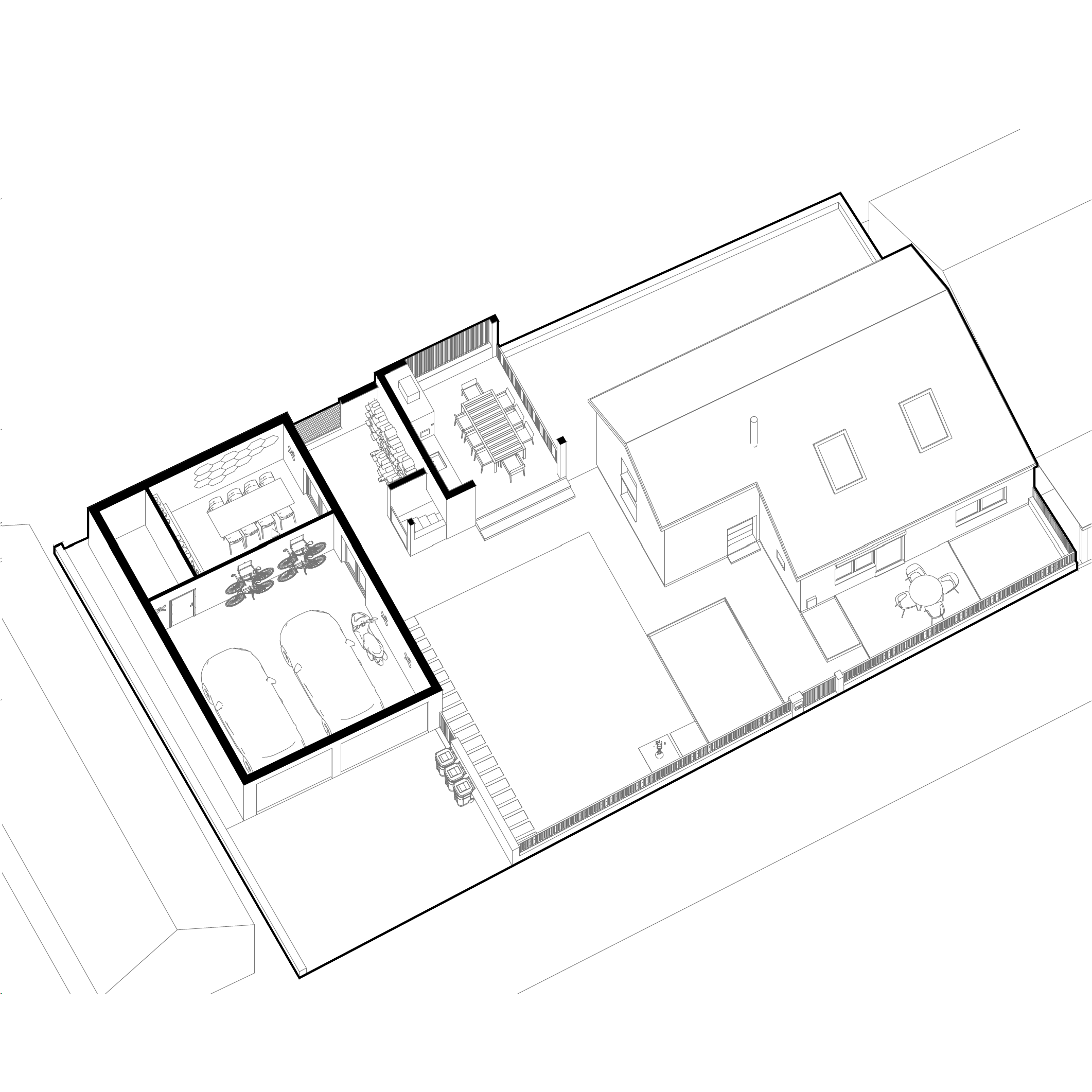 An architectural axonometric view of G House, showcasing the full layout of the property. The design emphasizes the connection between indoor living spaces and the outdoor courtyard, creating a seamless flow between areas.