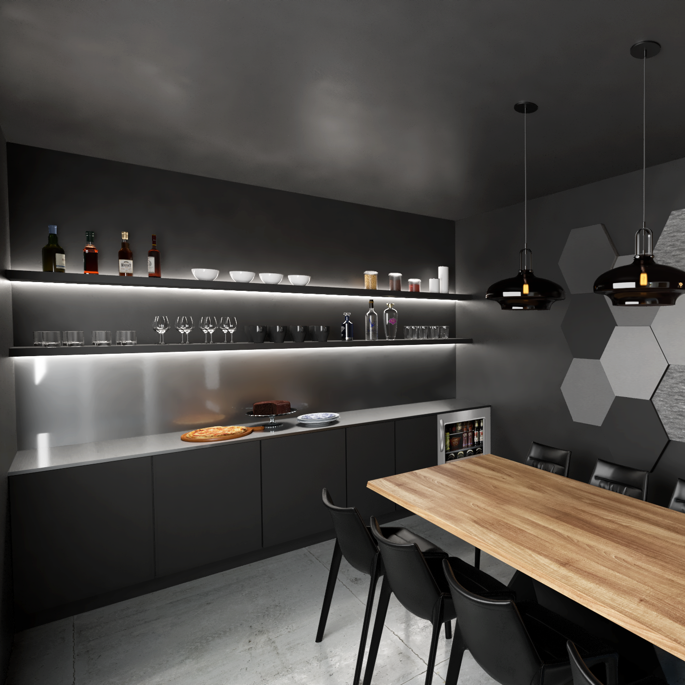 A separate, indoor space to hang out in the garden. A sleek kitchen featuring black cabinetry and stainless steel accents, and a minimalist bar for a sophisticated look.