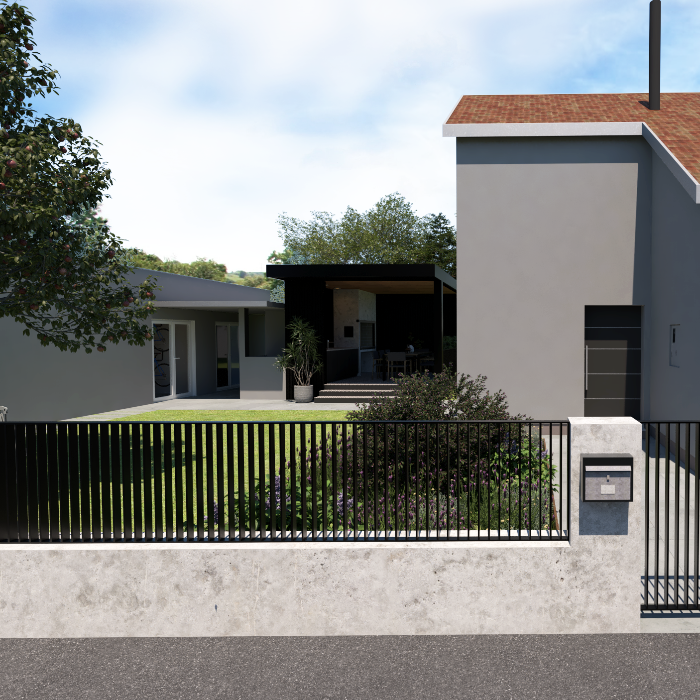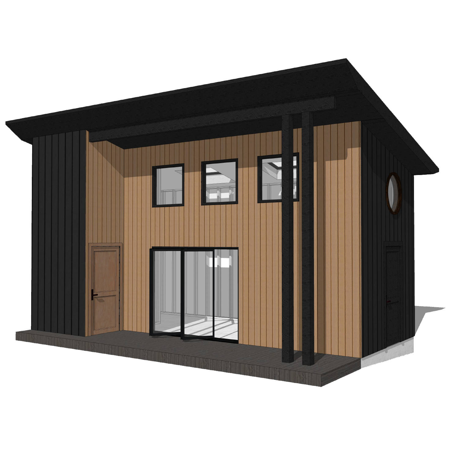 A 3D view of the pool house reveals its minimalist design, emphasizing clean lines and an open layout. The mix of vertical and horizontal siding, along with black accents, creates a bold yet timeless look.