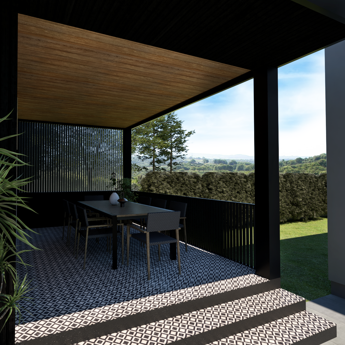 Outdoor dining area in G House, designed for both comfort and style. The covered patio with a wooden ceiling and patterned floor tiles creates a cozy environment for entertaining, offering stunning views of the landscape.