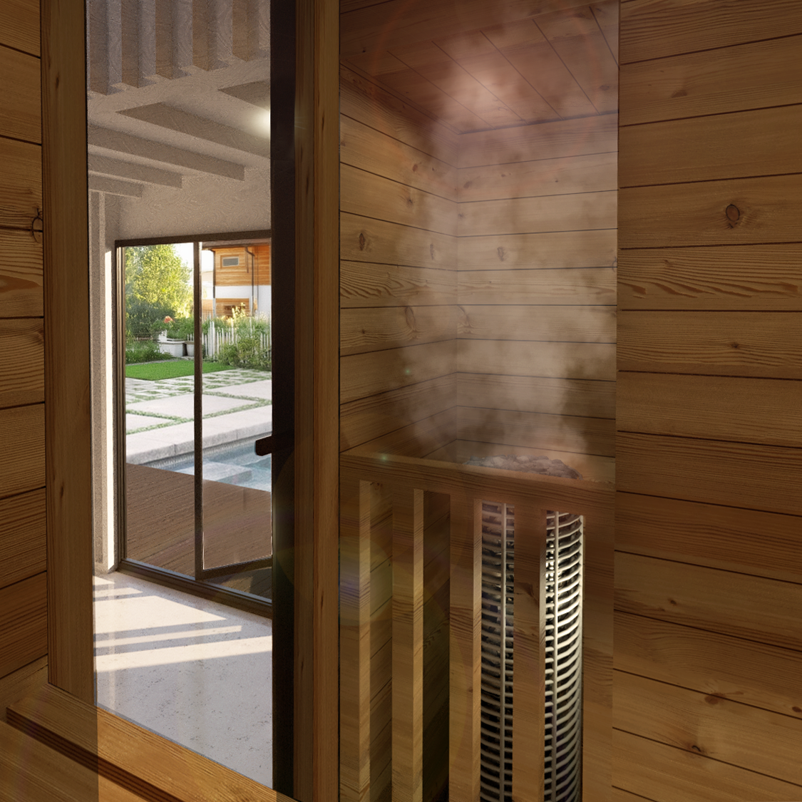 Inside the sauna, the warm wood tones and soft lighting create a serene, spa-like experience. Large windows offer a connection to the pool house, while steam rises, enhancing the relaxation factor of this modern escape.