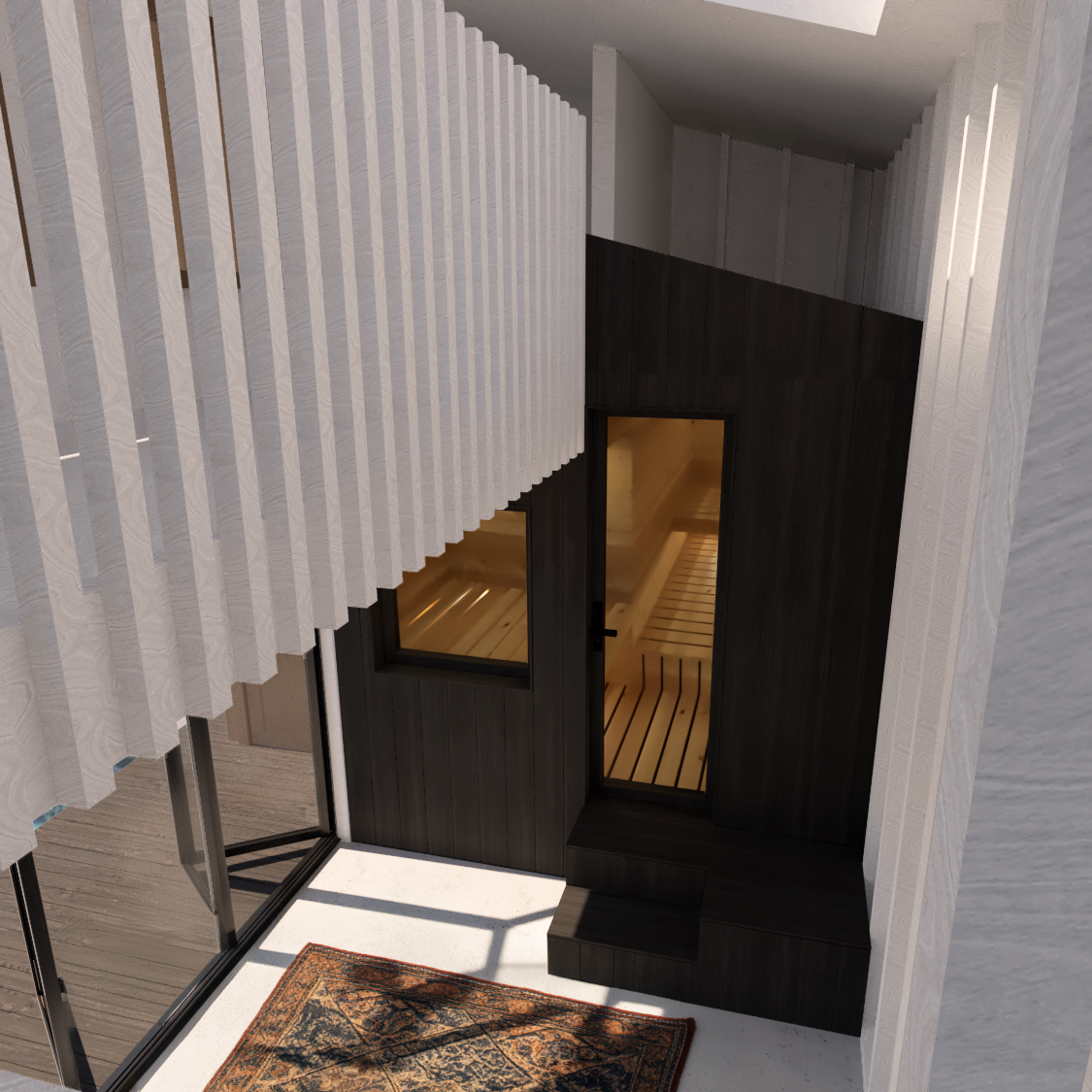 The sauna is a "house" within a house. The sleek entrance to the sauna area is enhanced by charred, slatted wood detailing and dark finishes. The design creates an inviting, cozy transition between spaces.