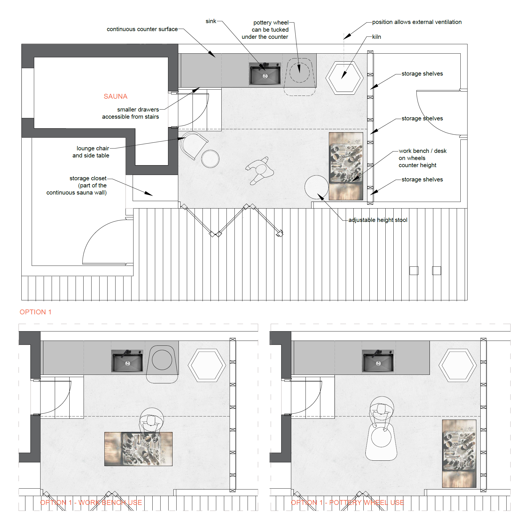 Exploring the option of having a pottery studio in the pool house. The sauna sits adjacent to it, with ample storage and workspace, making this multi-purpose space ideal for relaxation and creativity.