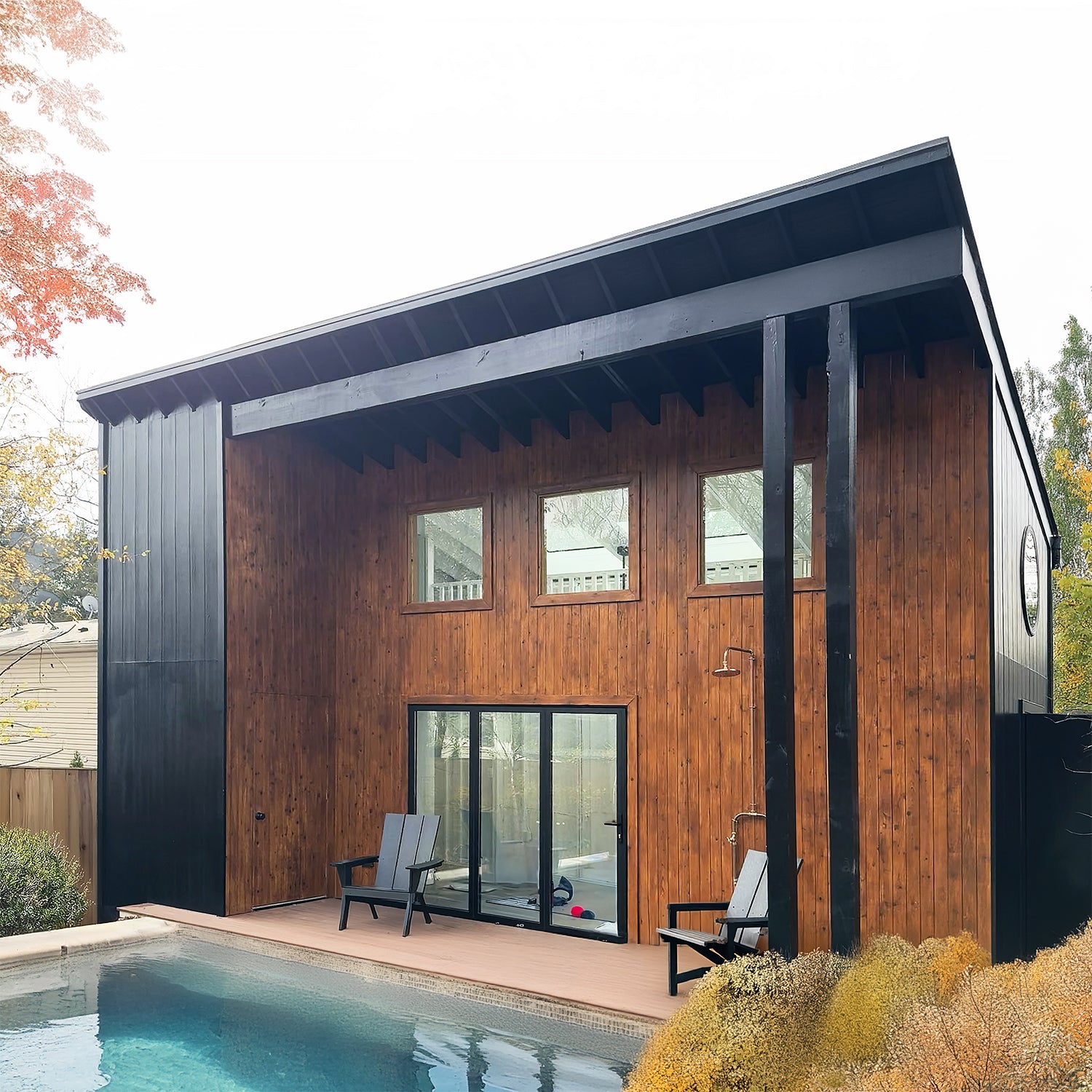 A modern pool house featuring a striking combination of black and natural wood siding. The high ceiling and large windows allow ample natural light to flow into the space, making it an ideal retreat by the pool.