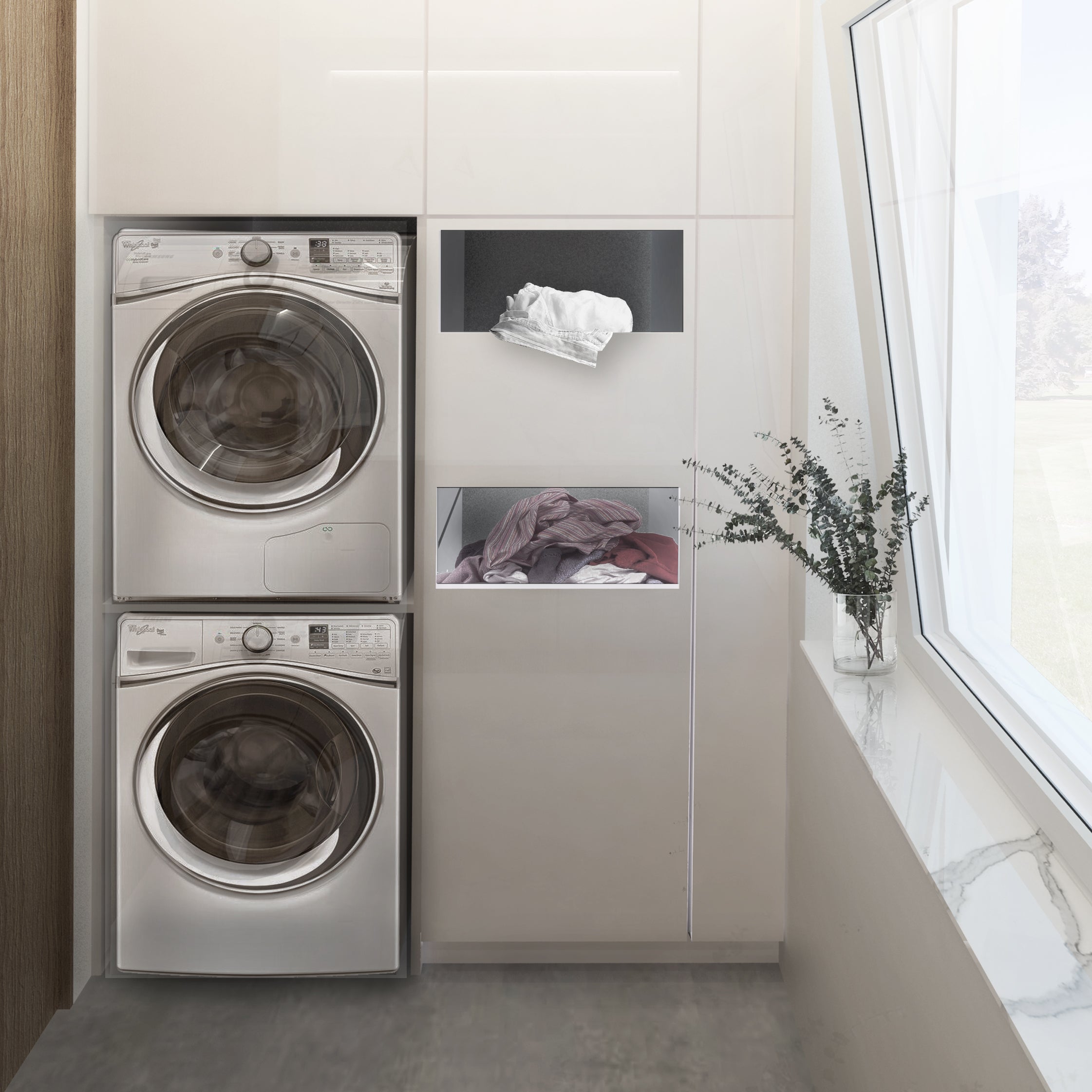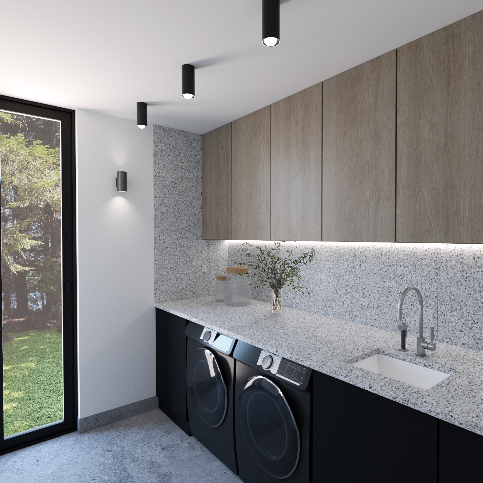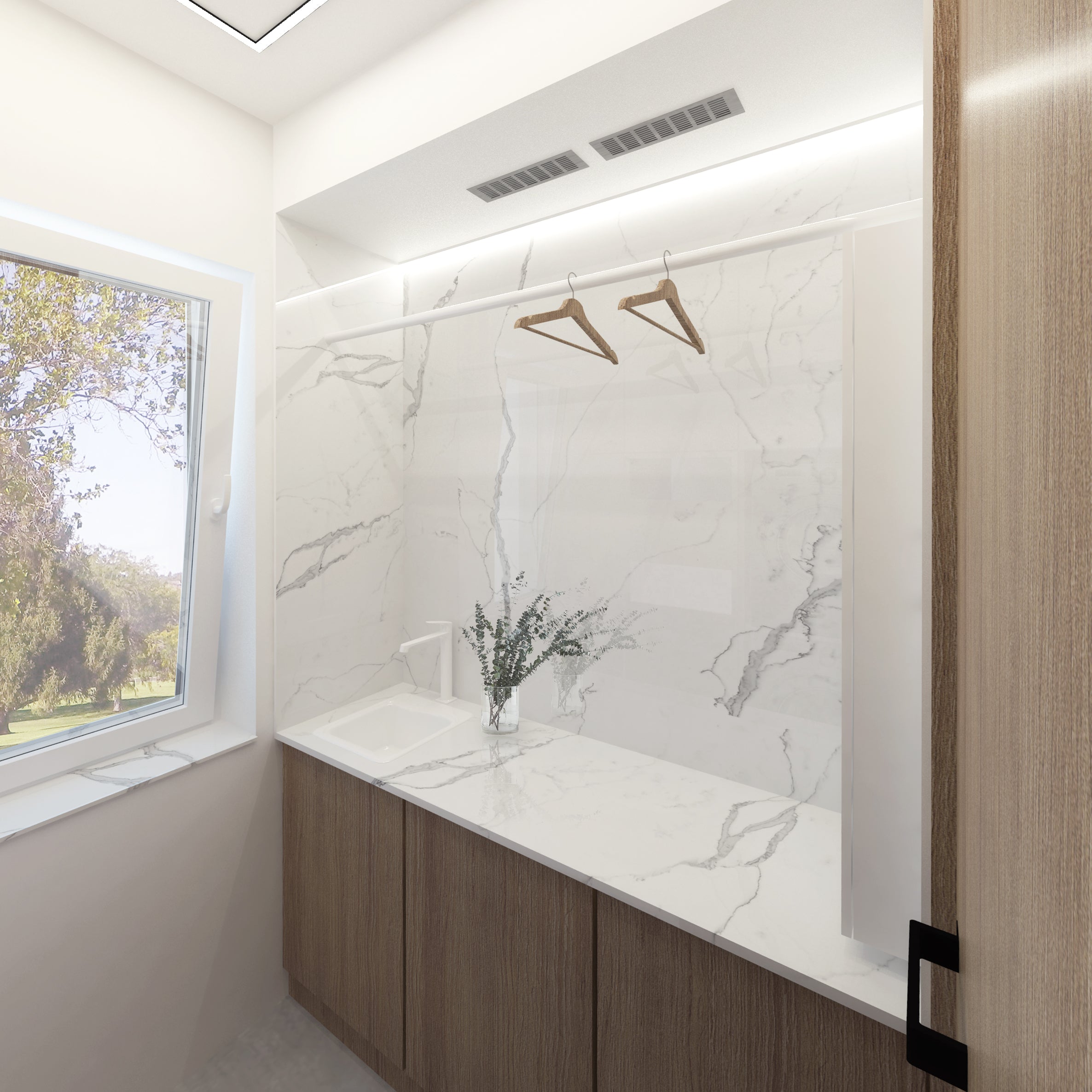A modern laundry room featuring terrazzo countertops and light oak cabinetry. The floor-to-ceiling window brings in natural light, creating an airy, functional space that seamlessly blends indoor utility with outdoor views.
