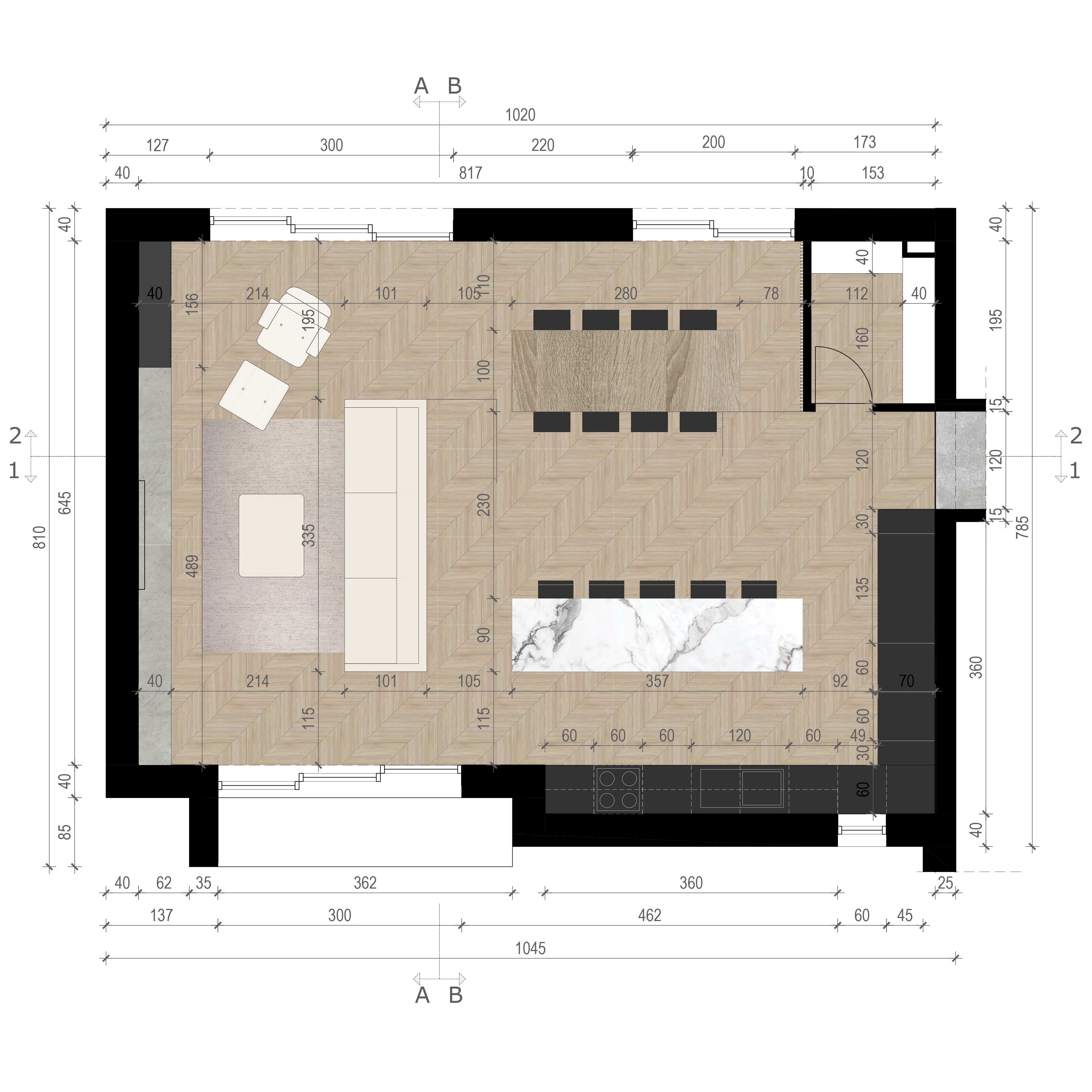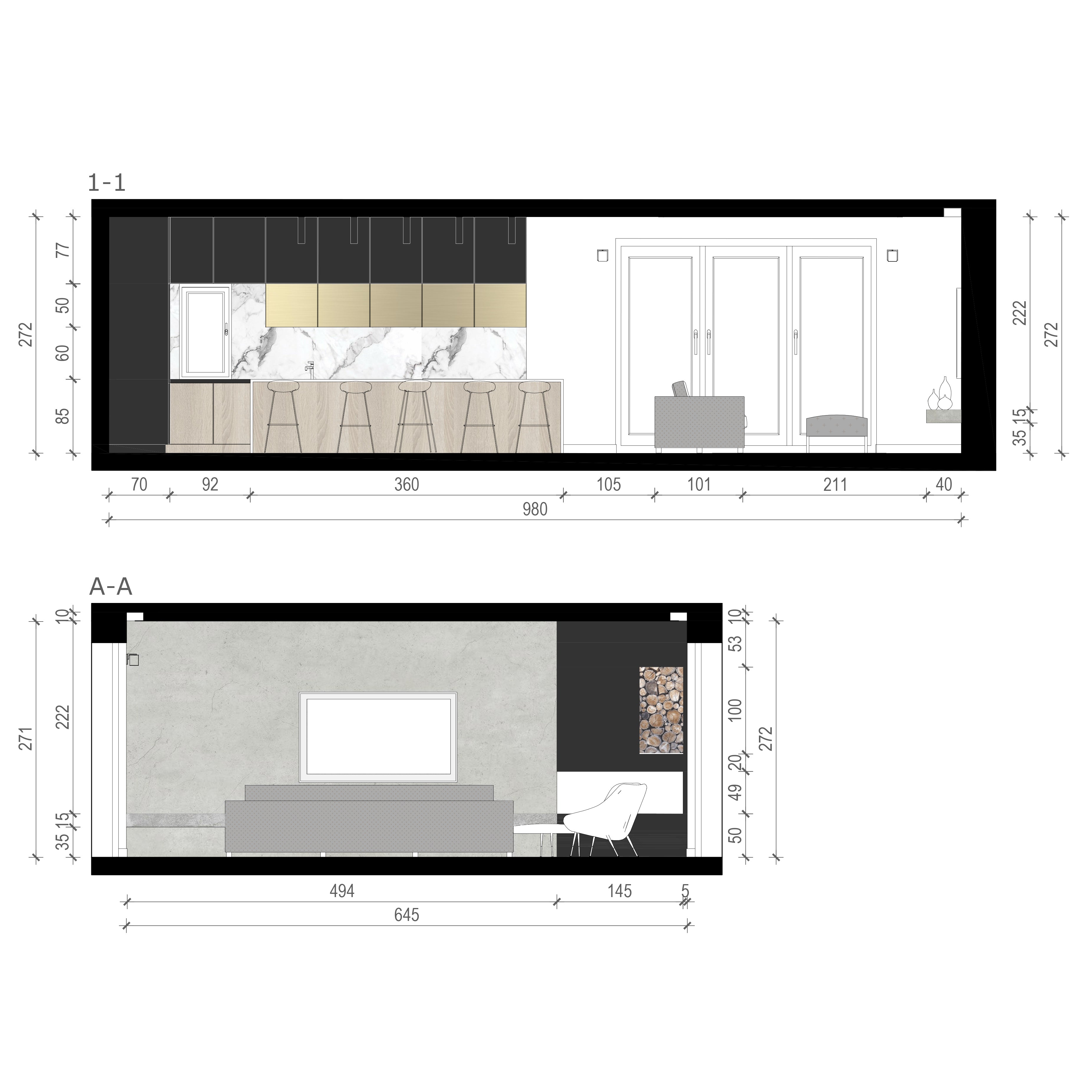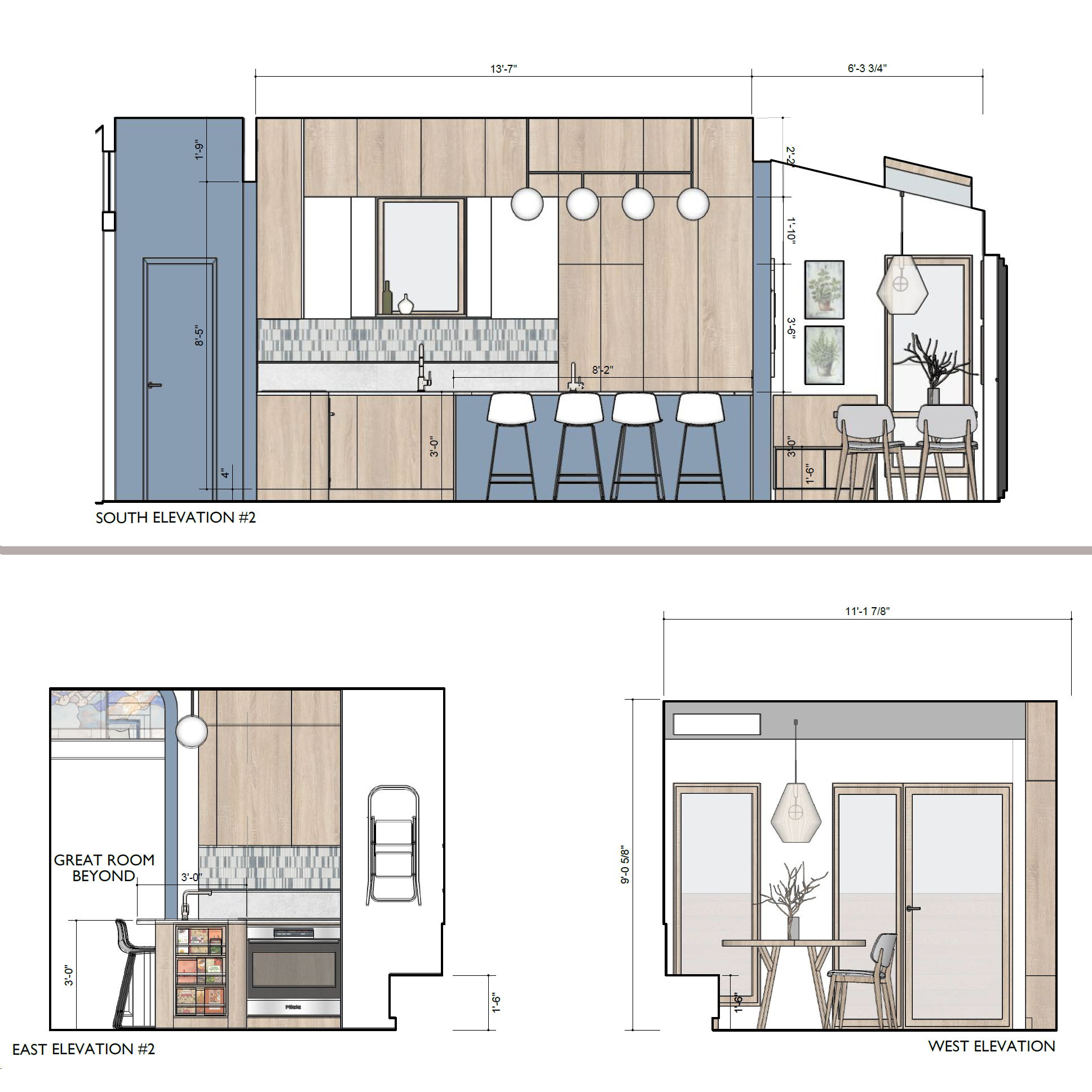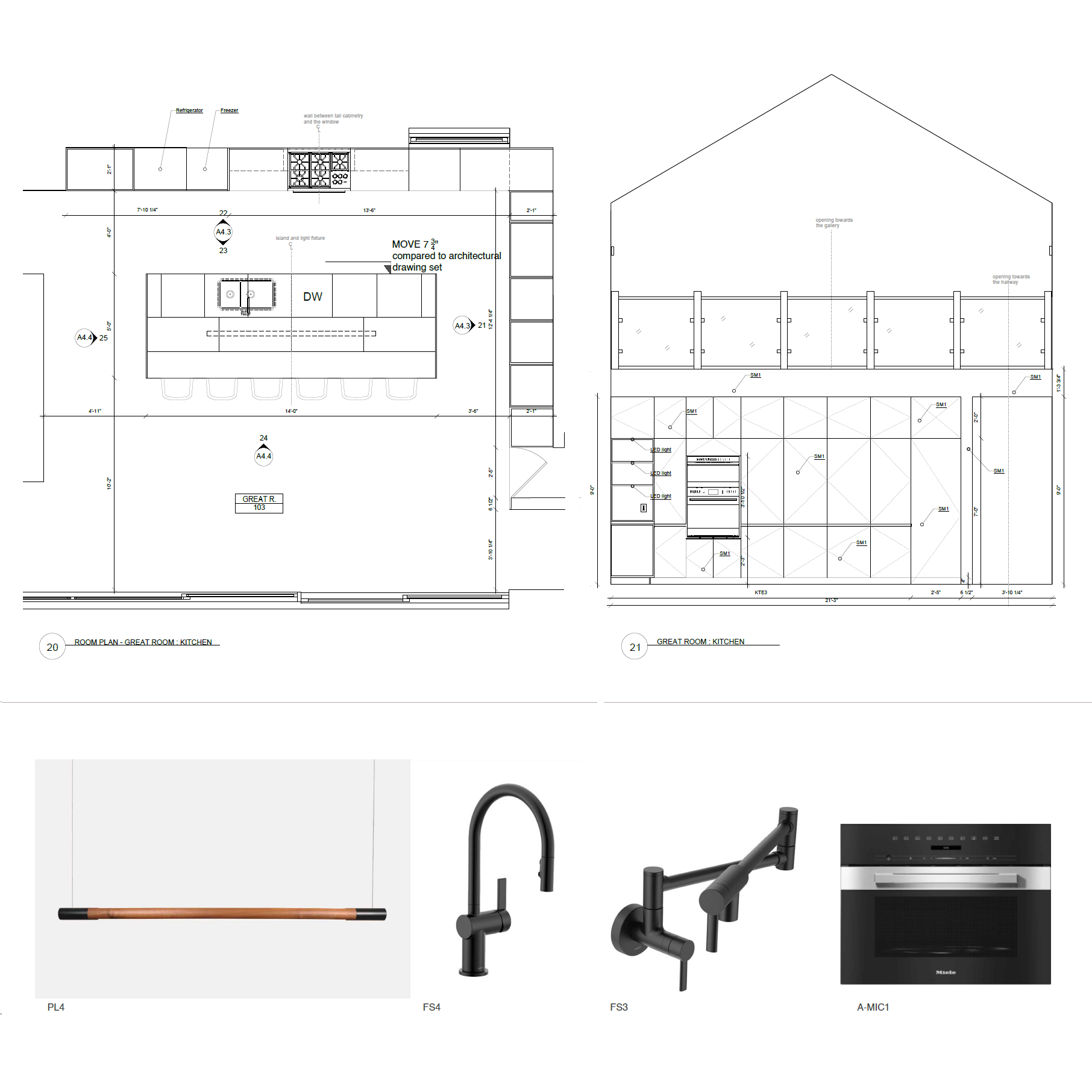 Detailed kitchen floor plans and elevations, showcasing the layout of the kitchen island and cabinetry. The design prioritizes functionality and flow, ensuring an efficient workspace while maintaining an open and inviting aesthetic.