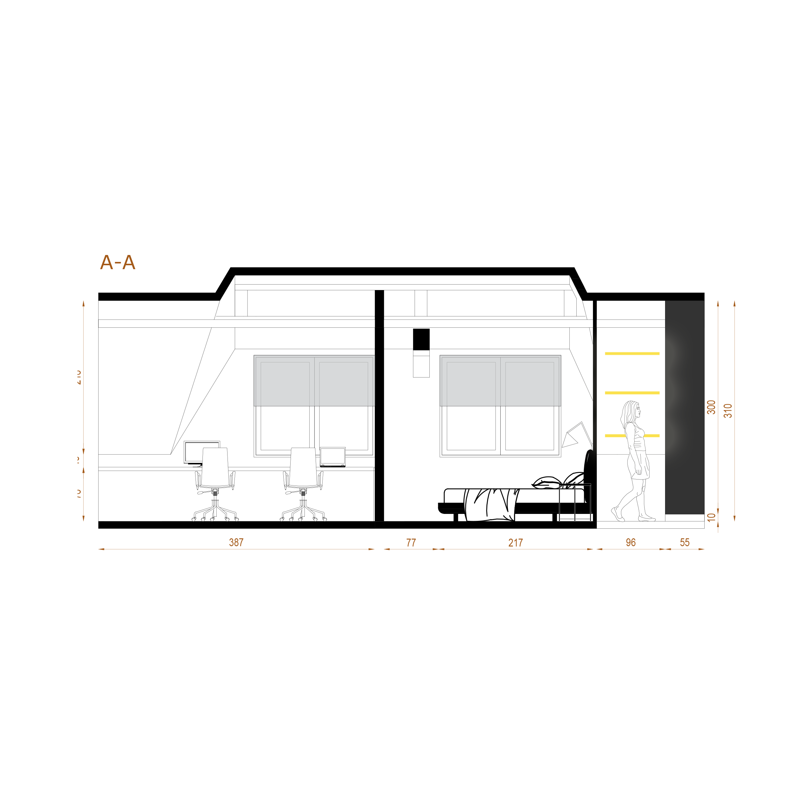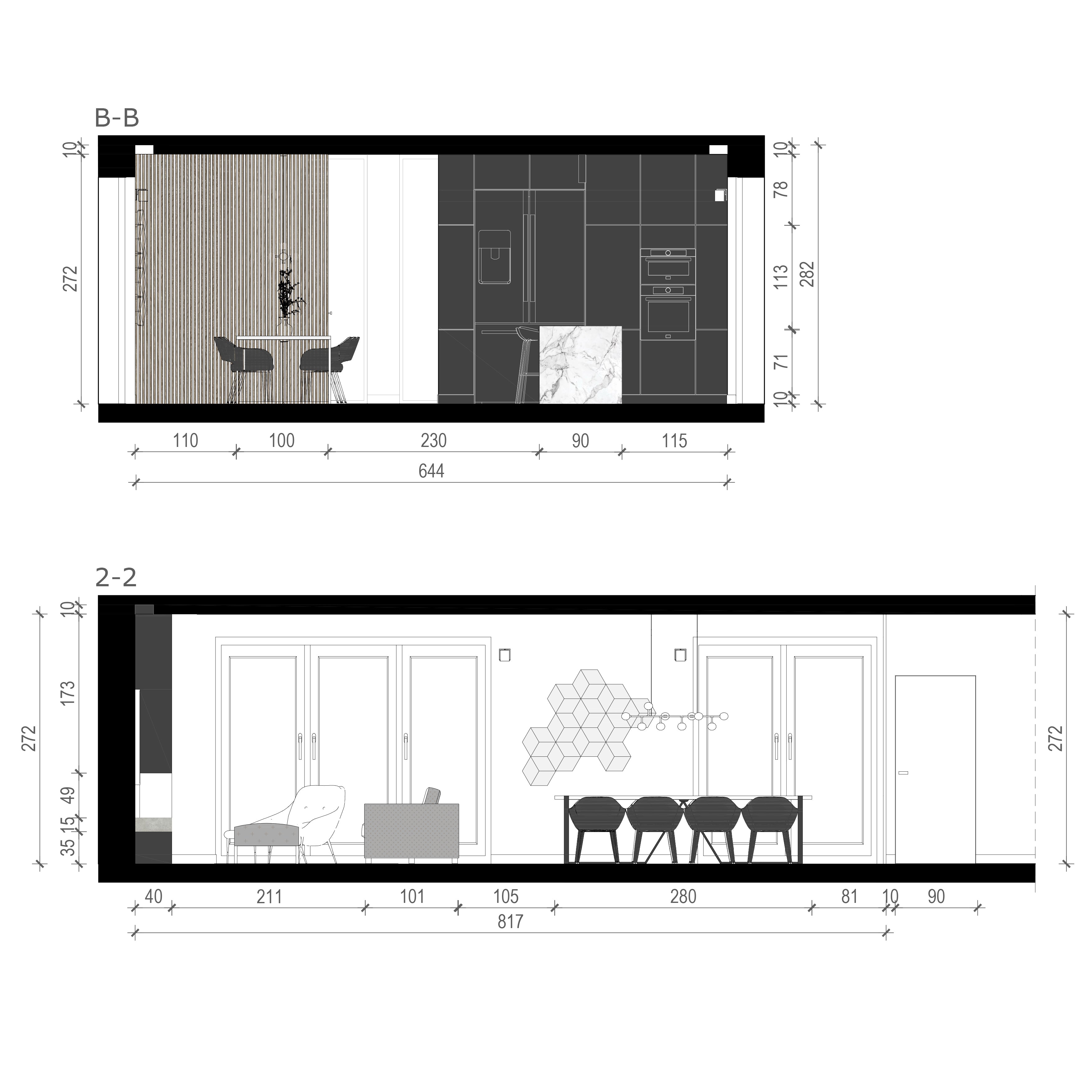 Sections showing the placement of wood slatted wall and acoustic wall panels, as well as the nice contrast of black and marble in the kitchen.