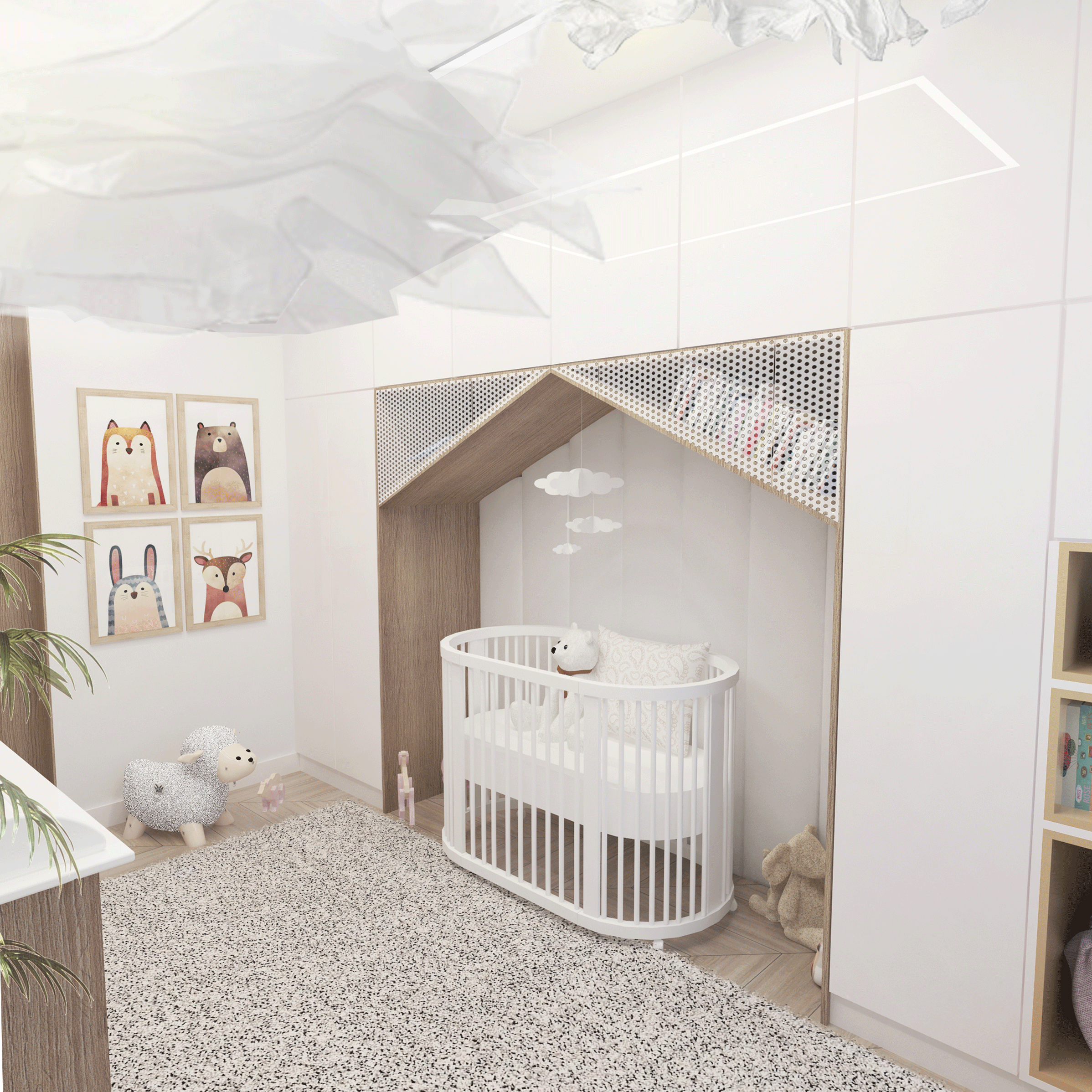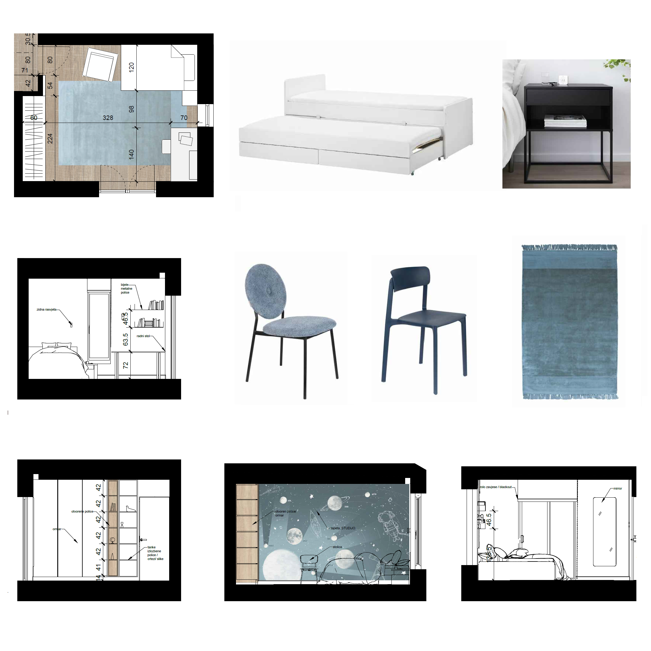 Design plans and furniture selection for the boy's bedroom. The palette includes a mix of playful yet practical pieces, such as a trundle bed, modern chairs, and a cozy blue rug. The layout is carefully planned to maximize space and comfort.