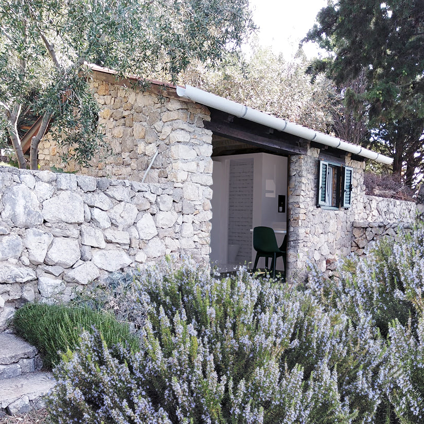 View from the outside. With the large double door opened, the house expands into the lavender and pine garden in front. Stone walls are left untreated on the inside too.