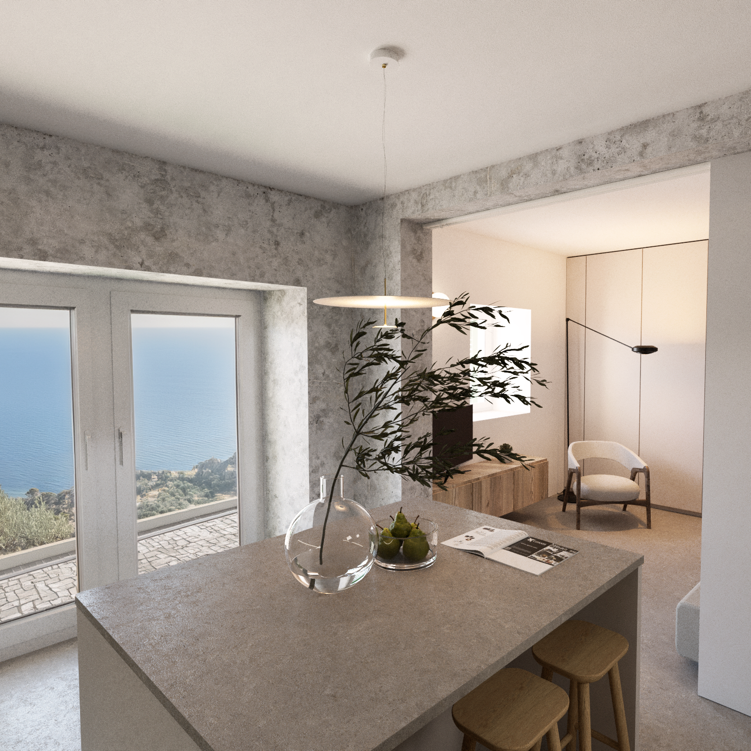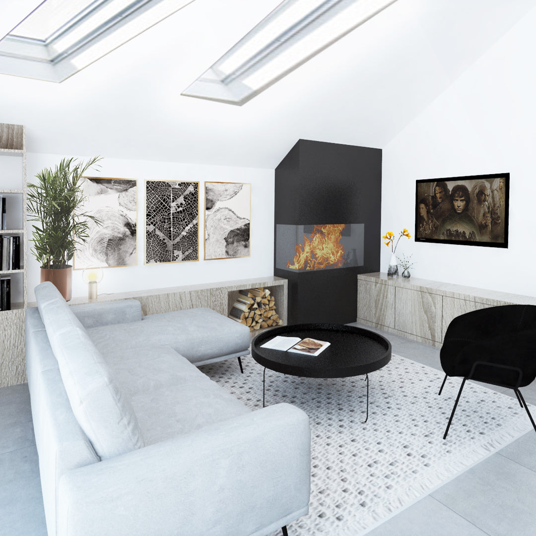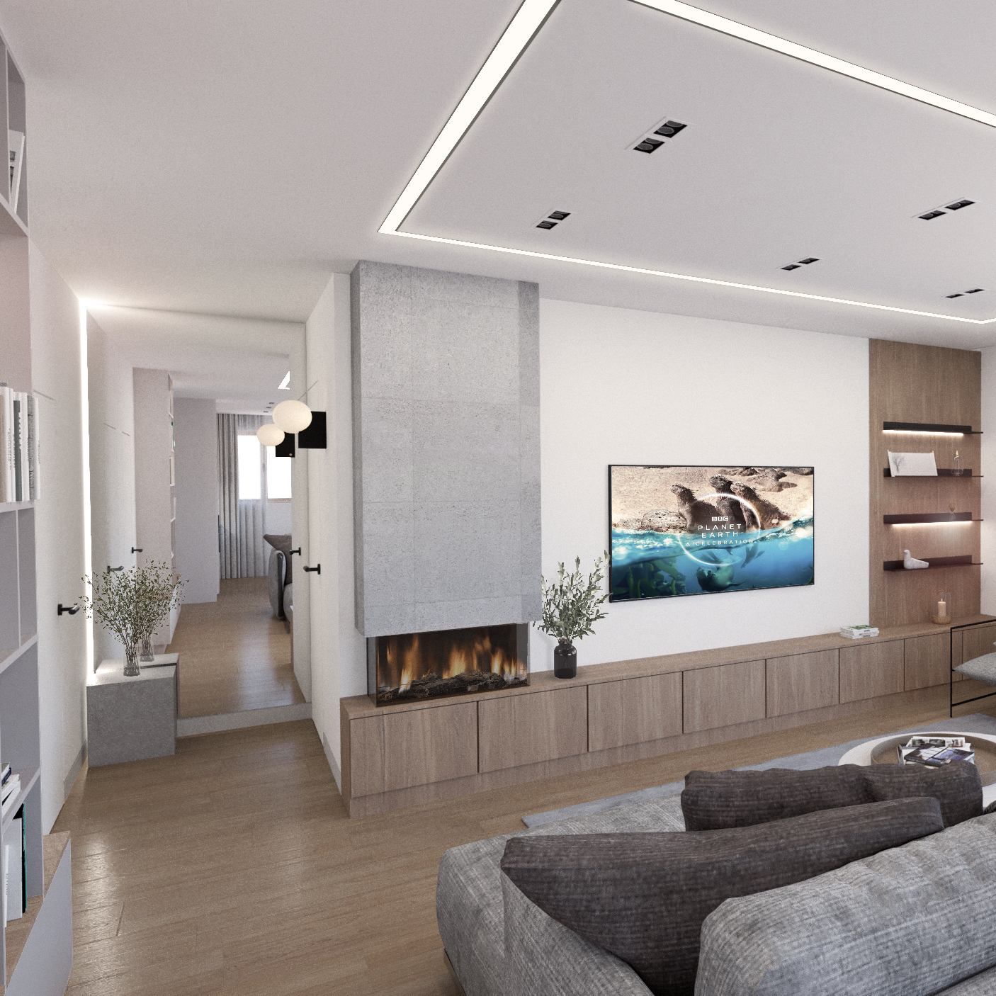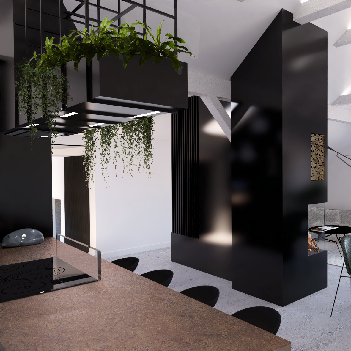 Wall elevations showing the kitchen with the material application, and the living room with a raw concrete wall and beautiful black fireplace.