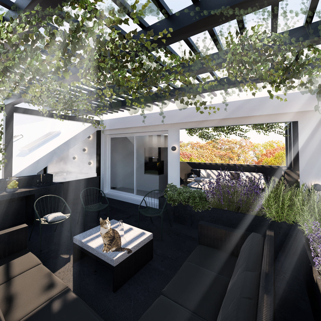 A serene rooftop terrace with a pergola covered in greenery. This outdoor space blends nature and comfort, creating the perfect spot for relaxation.