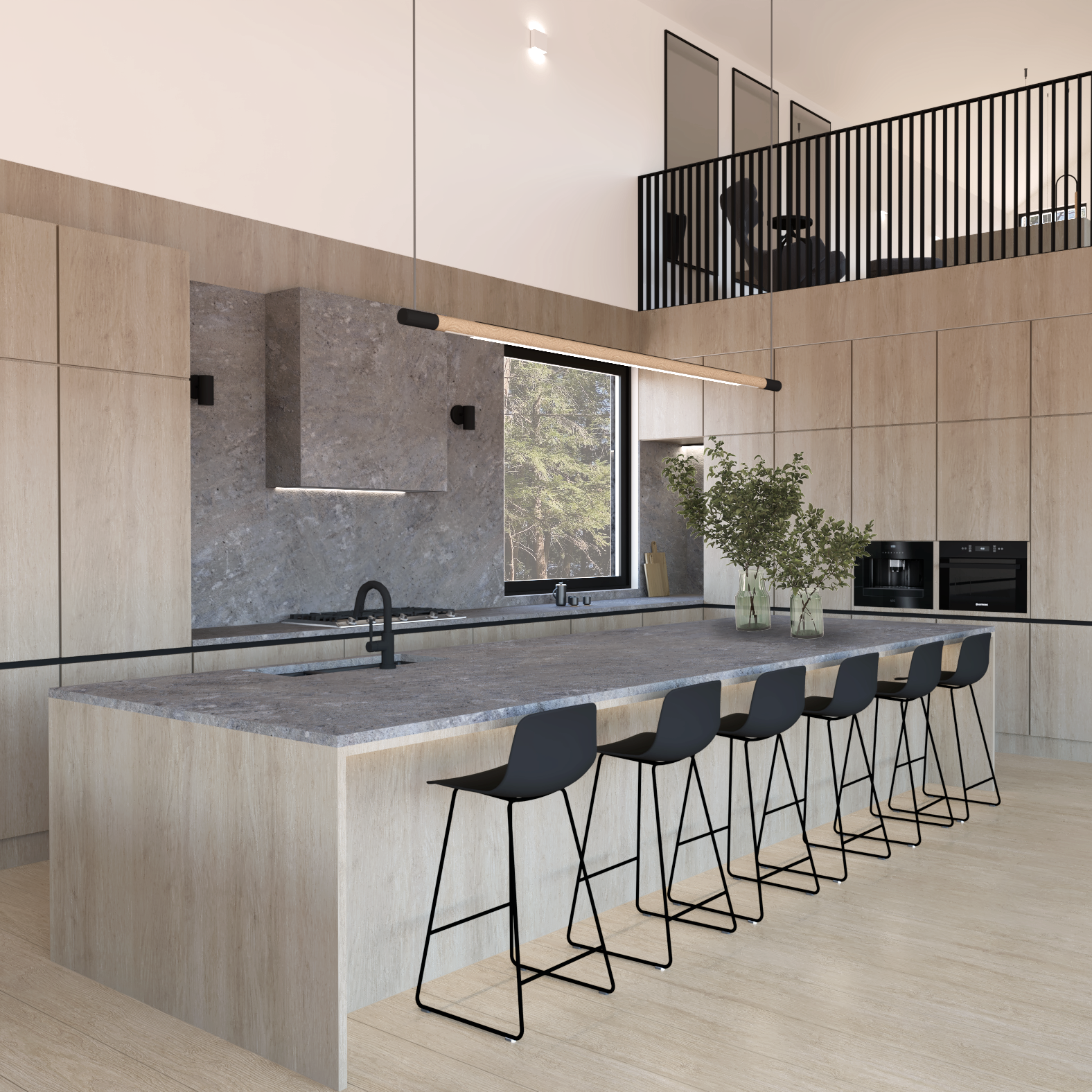 A modern, minimalist kitchen with light oak finishes and sleek black fixtures. The oversized island serves as both a workspace and a social hub, framed by dark accent lighting and a spacious double-height ceiling