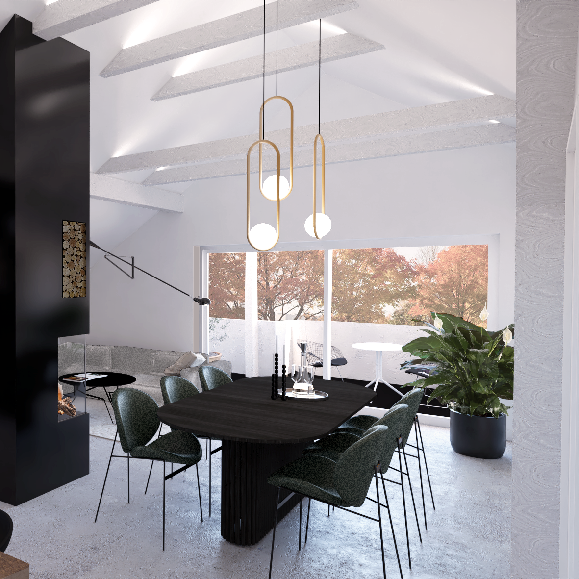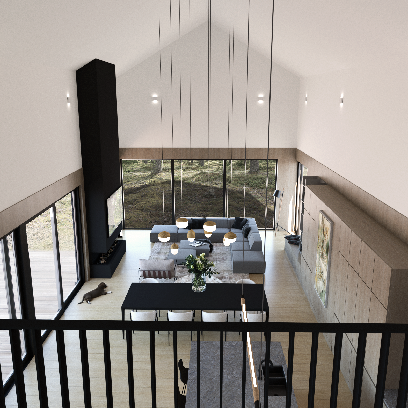An elevated view of the open-plan living and dining area, showcasing the high ceilings and large windows. The space is anchored by a dramatic black fireplace, with modern lighting and soft furnishings.