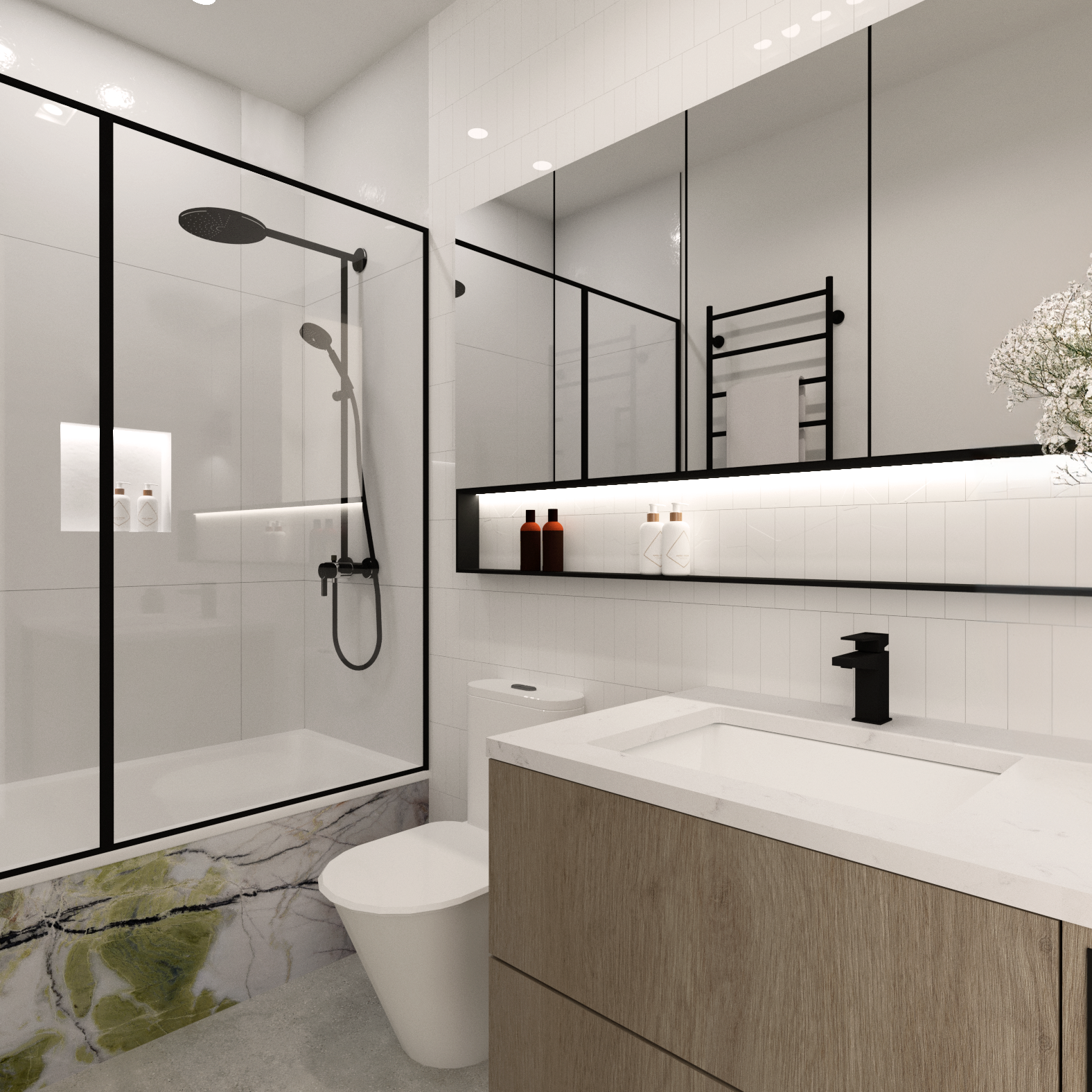 A contemporary bathroom with a glass-enclosed shower, black fixtures, and a clean, neutral palette. The combination of marble and wood accents adds a touch of luxury, while the spacious vanity provides ample storage.