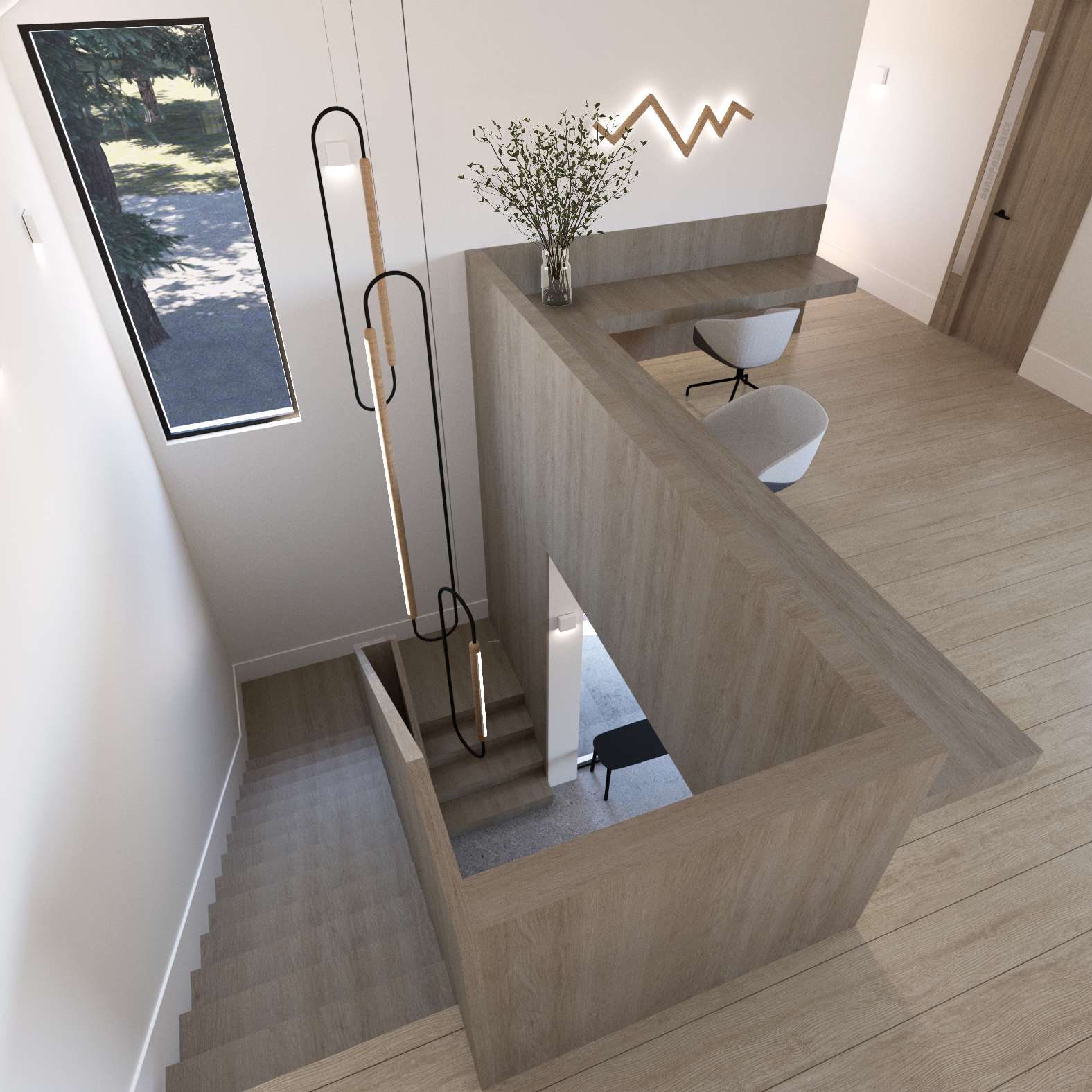 A sleek, modern staircase with light wood finishes leads to an open landing area. The minimalist design is complemented by striking pendant light fixtures, adding a contemporary touch and creating a warm, welcoming atmosphere.