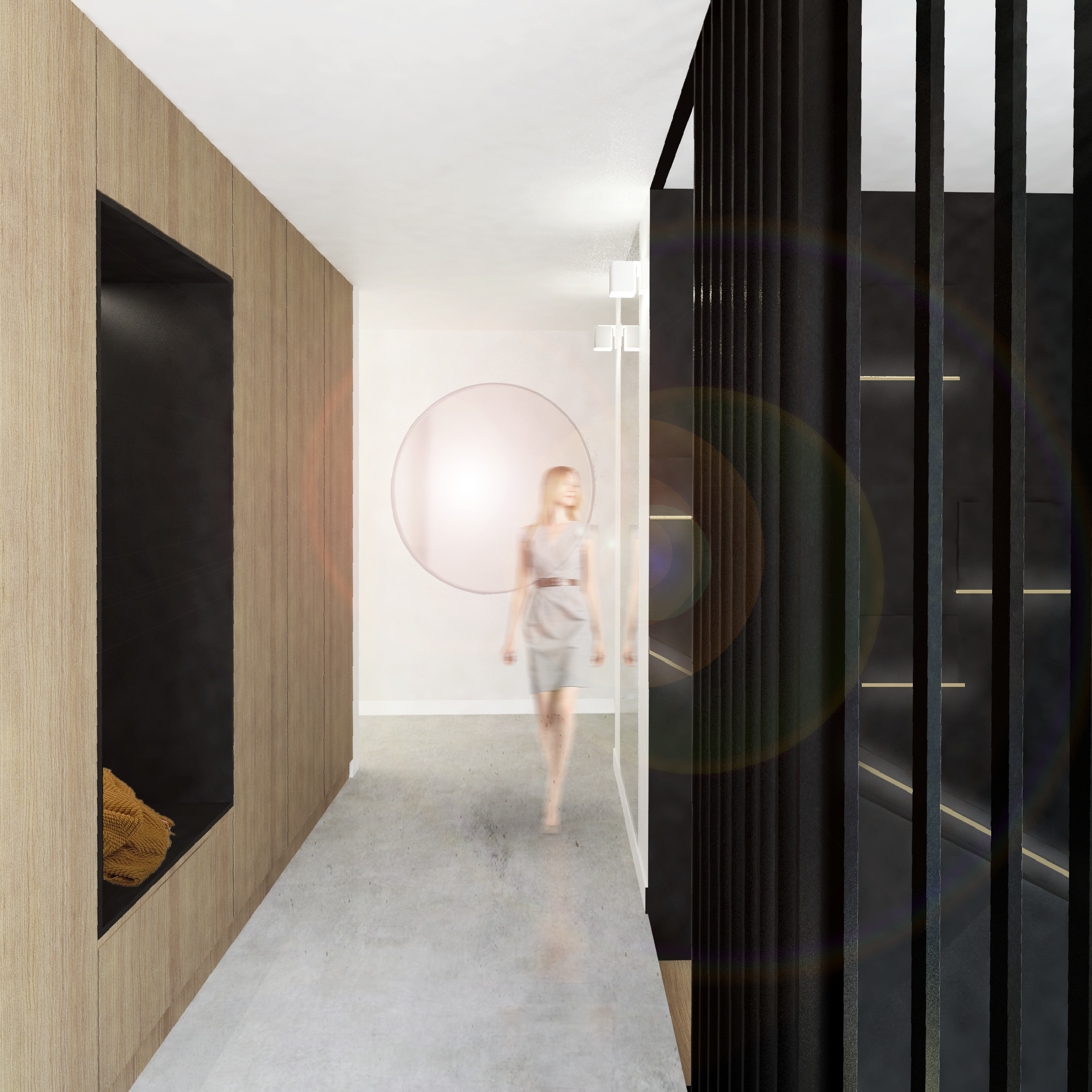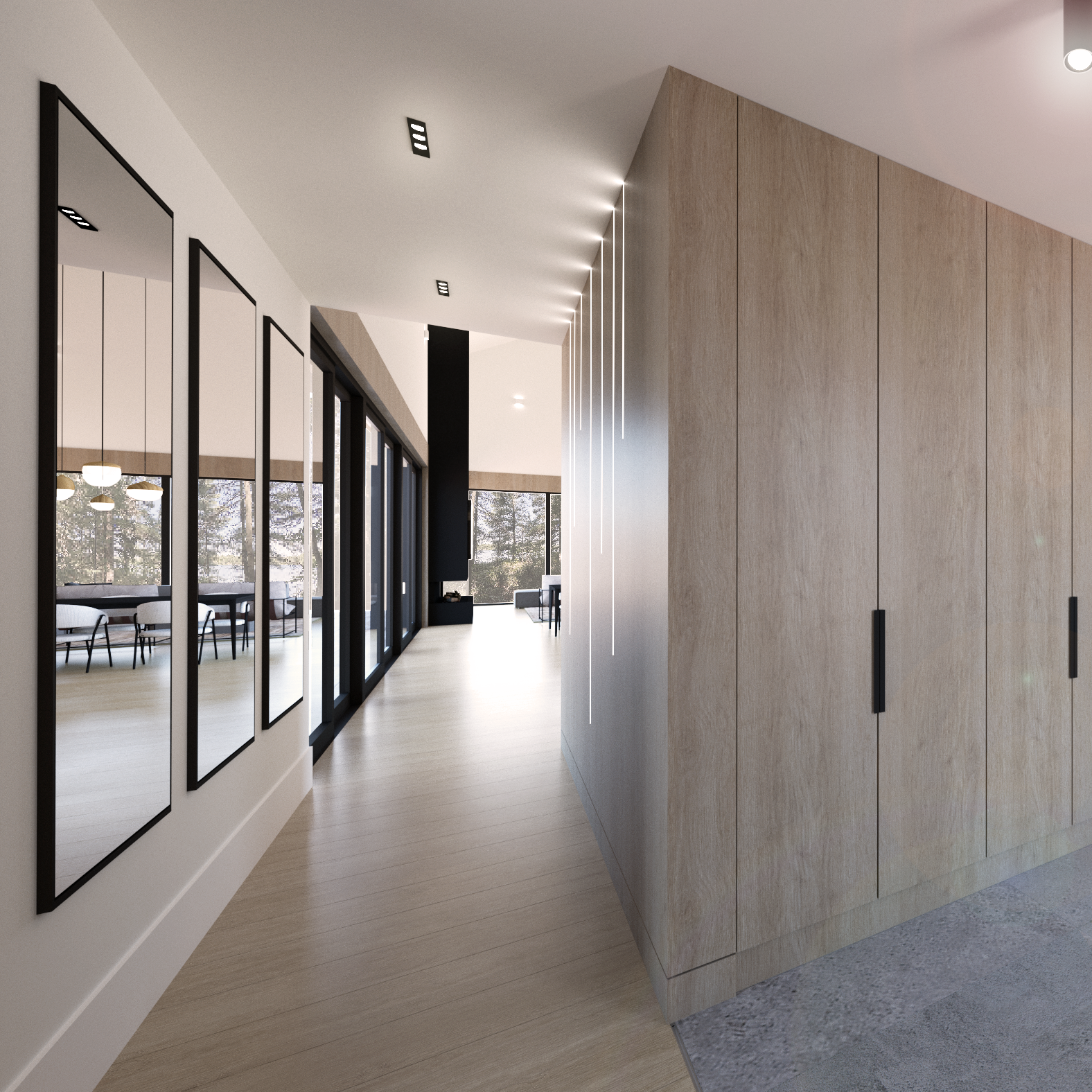 Hallway of the K house features a large entry closet in warm light oak and a black sitting nook. The focal point is a tinted mirror at the end of the corridor. Opposite to the closet are the basement level stairs with black walls and wall light features.