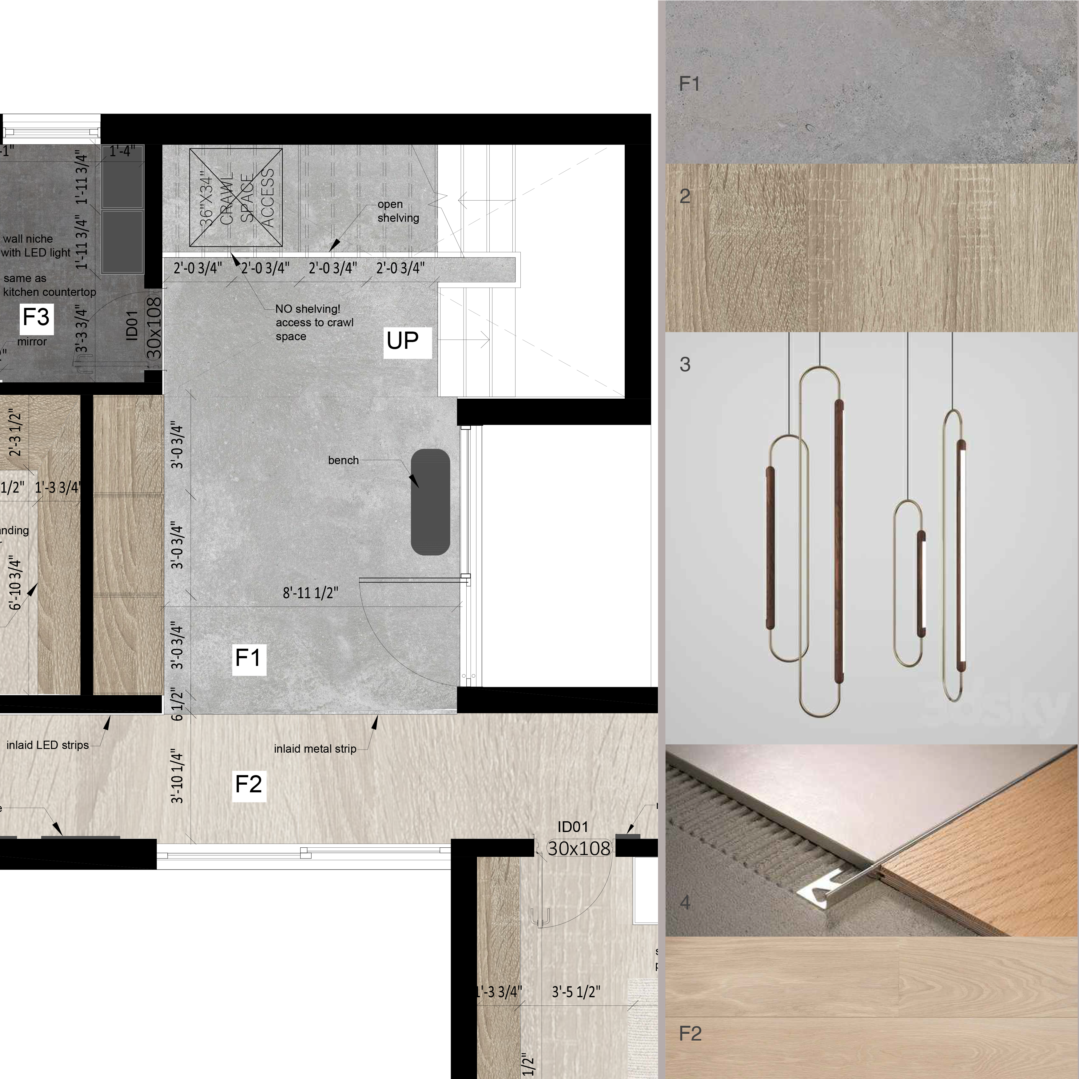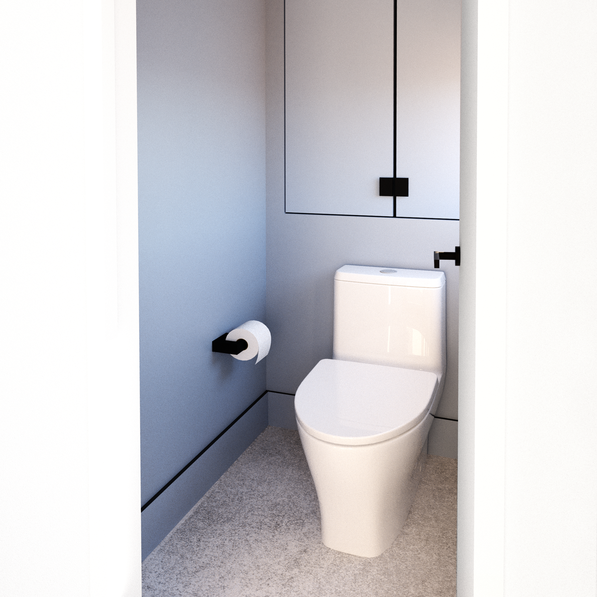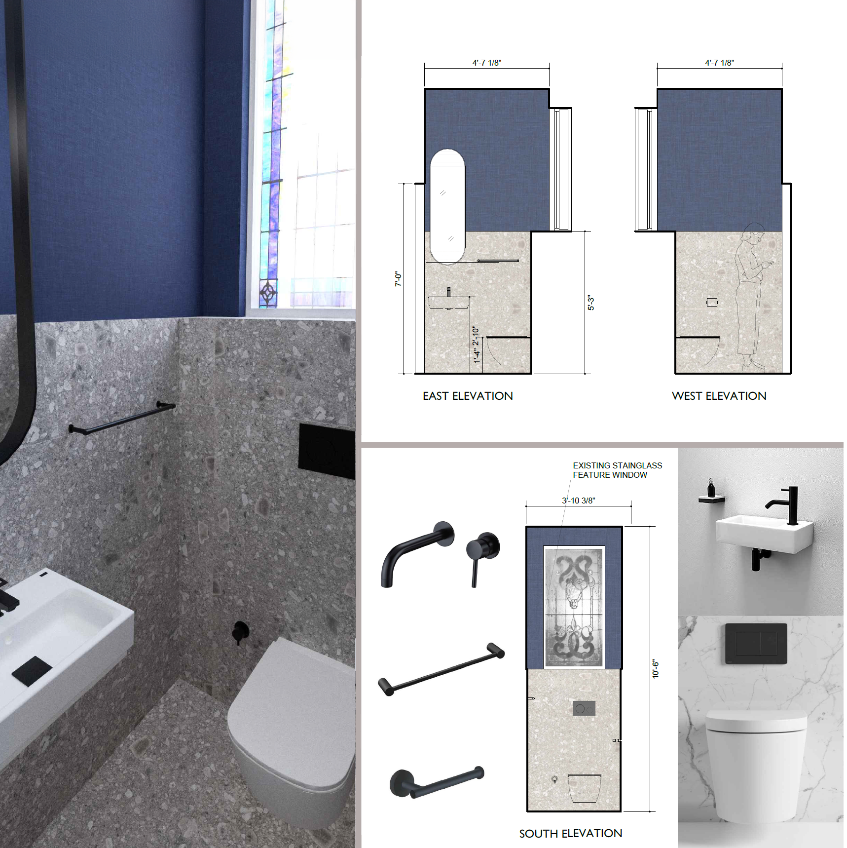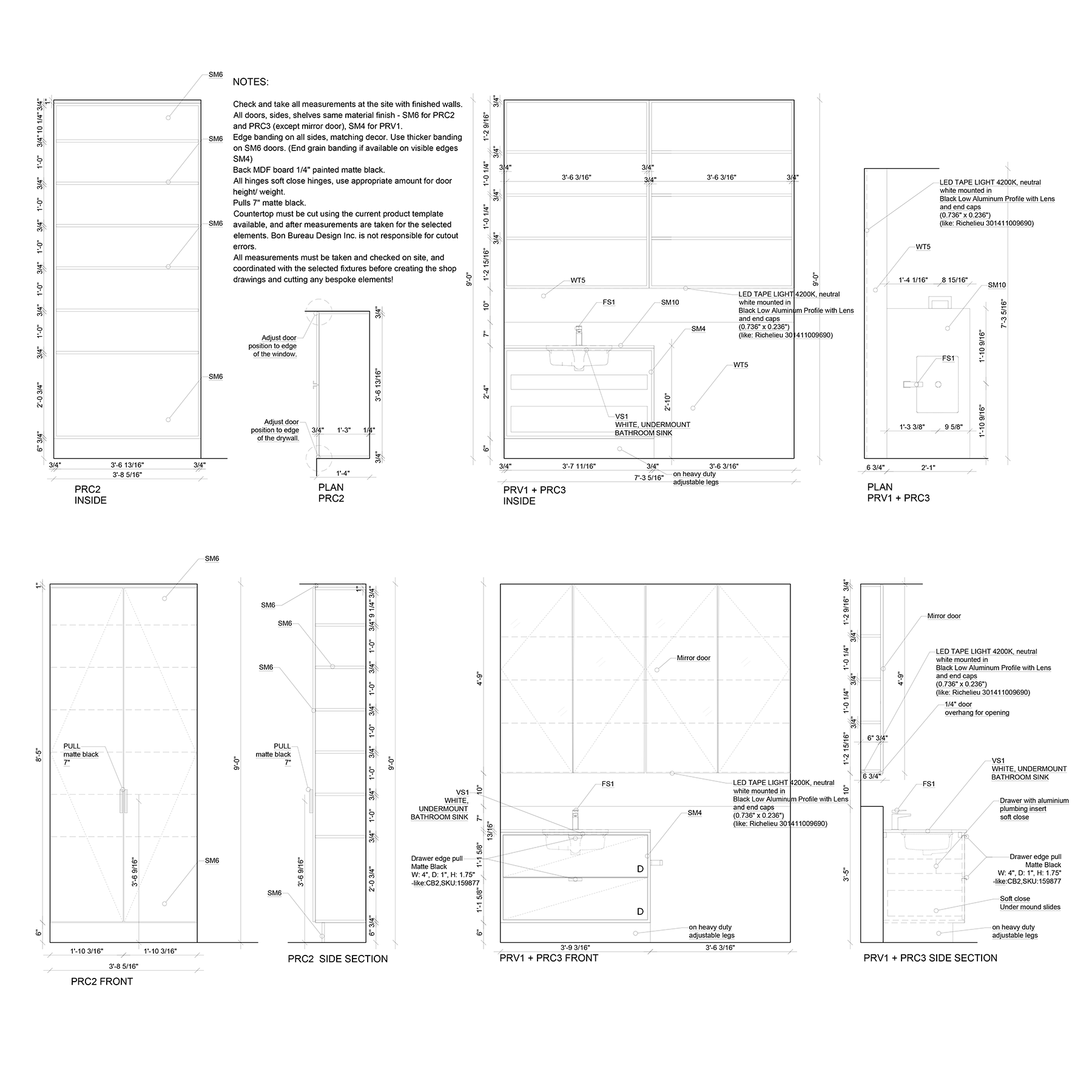 Comprehensive technical drawings outlining custom cabinetry and detailed elevations of the powder room. These drawings provide insight into the precision and care taken in creating a seamless integration of storage, and style.