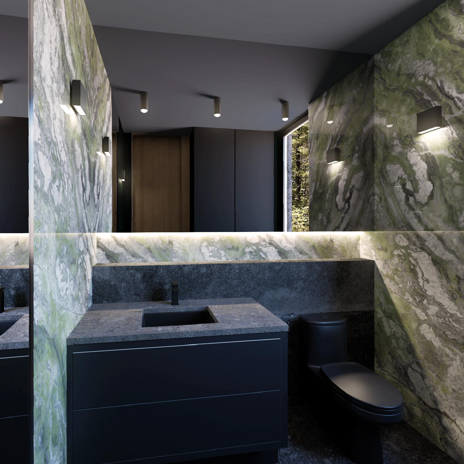 The powder room makes a bold statement with green marble walls, paired with black fixtures and a sleek black vanity. Soft lighting highlights the rich textures, creating a luxurious, spa-like atmosphere.