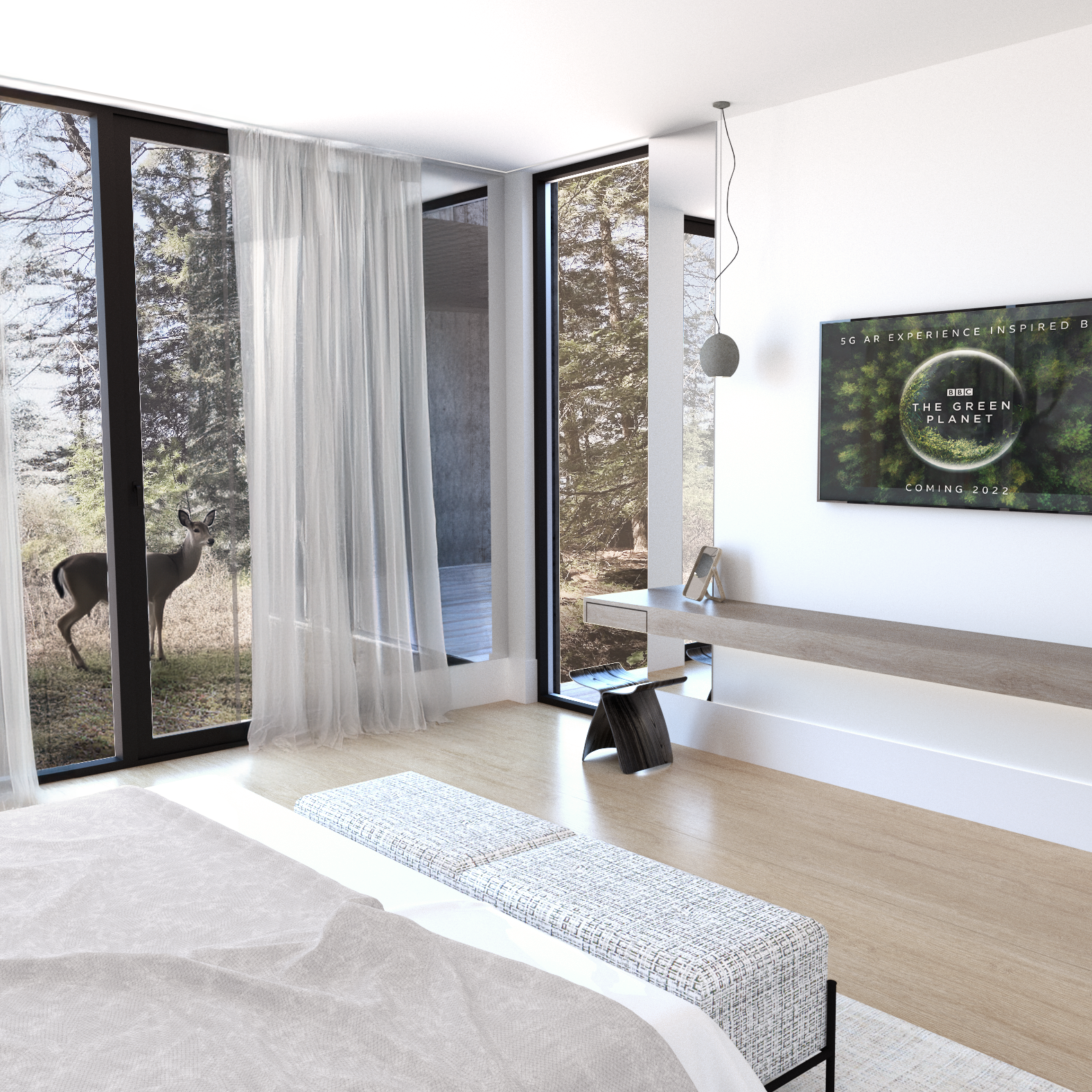 A serene bedroom with floor-to-ceiling windows offering breathtaking views of the surrounding nature. The soft, neutral tones and minimalist furniture create a calm and inviting space, perfect for relaxation and unwinding.