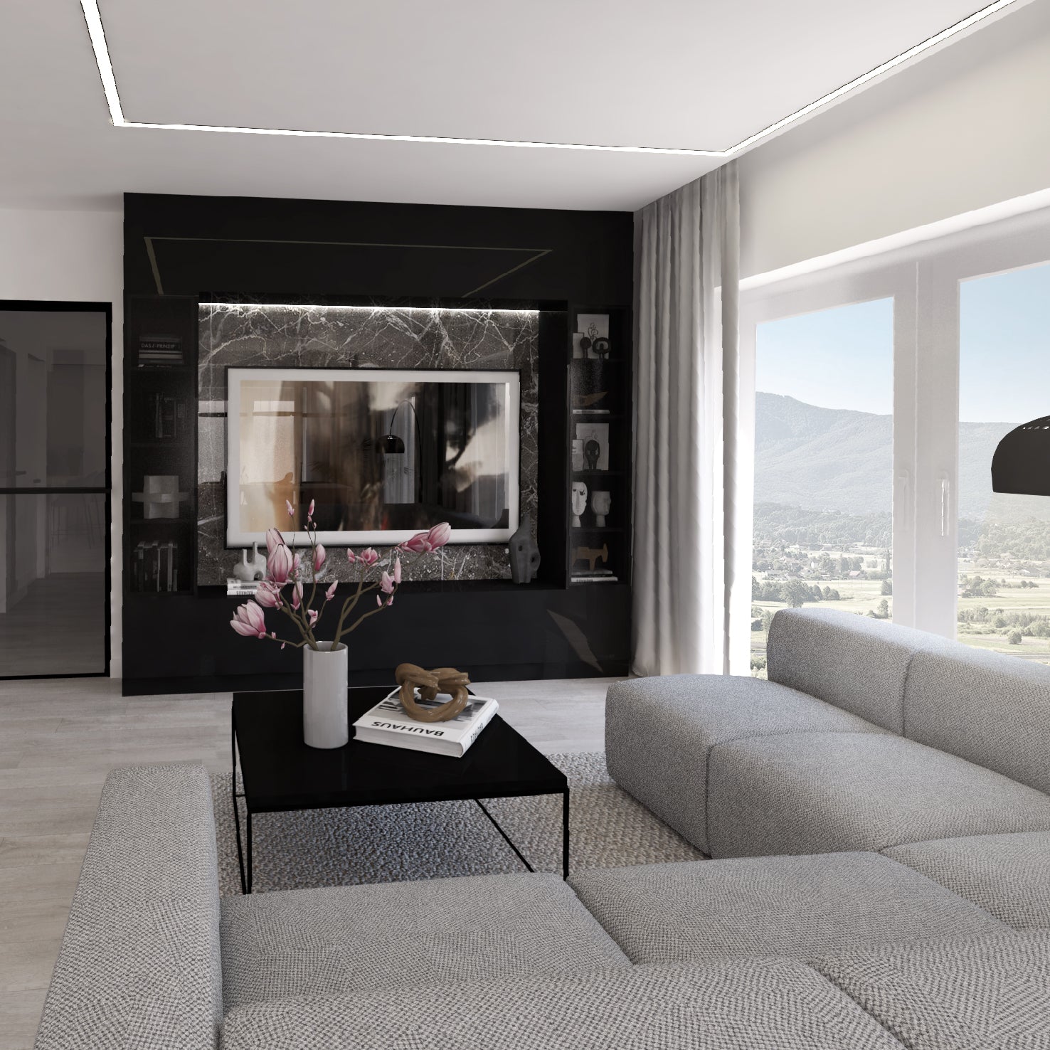 A modern living room featuring a sleek, gray sectional sofa and an elegant black marble TV feature wall. The expansive windows allow natural light to flood the room, enhancing the minimalist yet luxurious atmosphere.