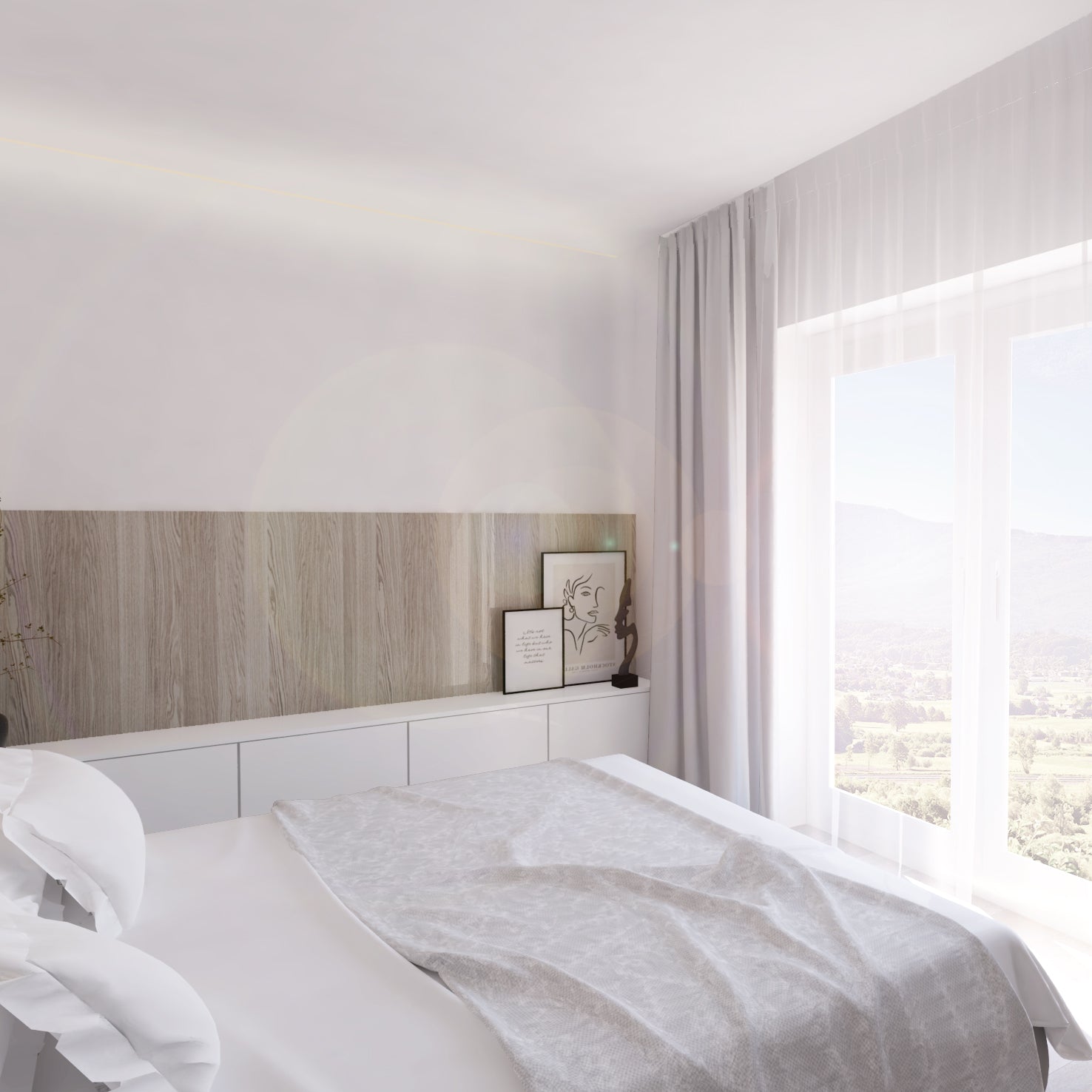 Elegant bedroom in light wood and white tones. Conducive to the best sleep, sheer curtains are complemented with blackout curtains, leaving the view to be enjoyed to the maximum.