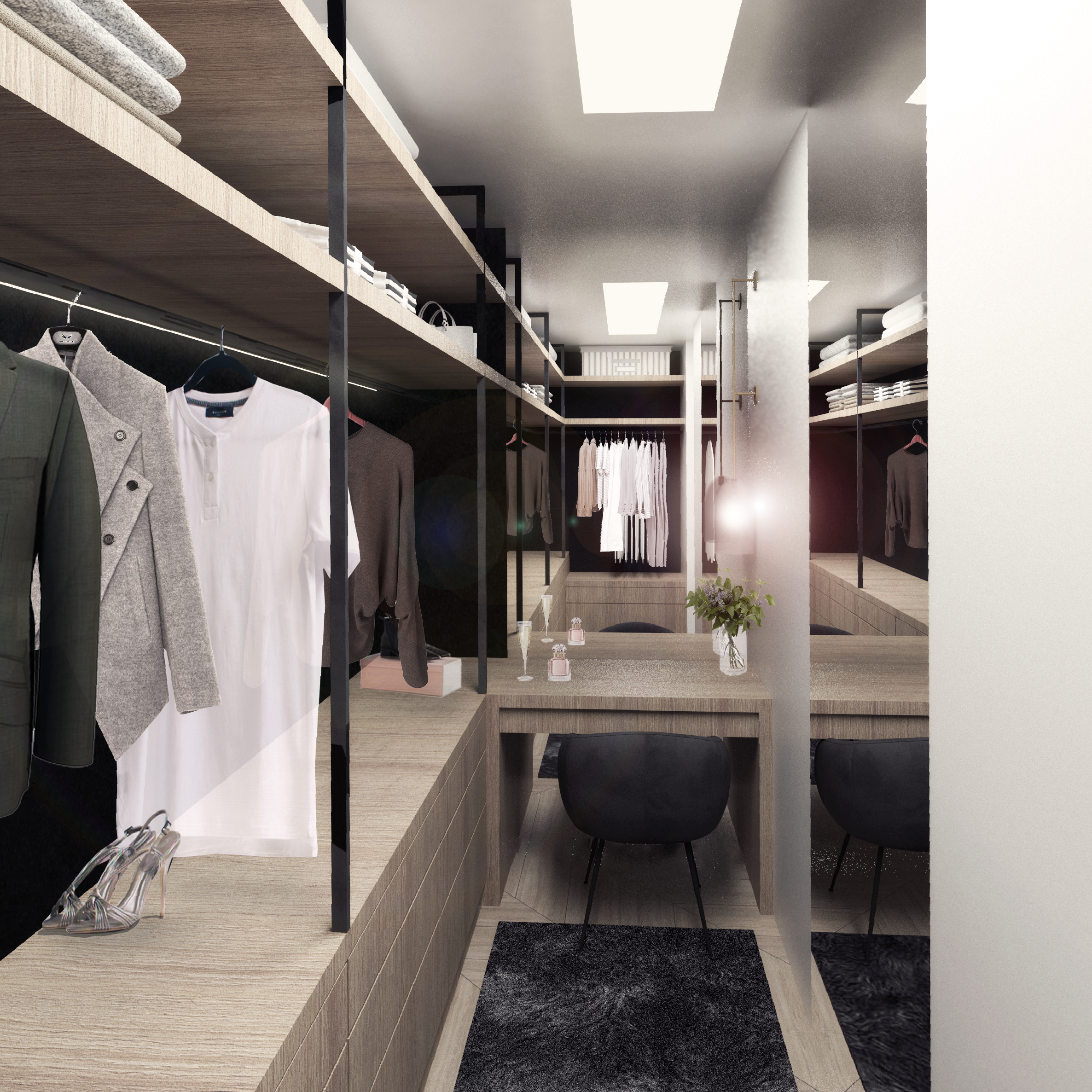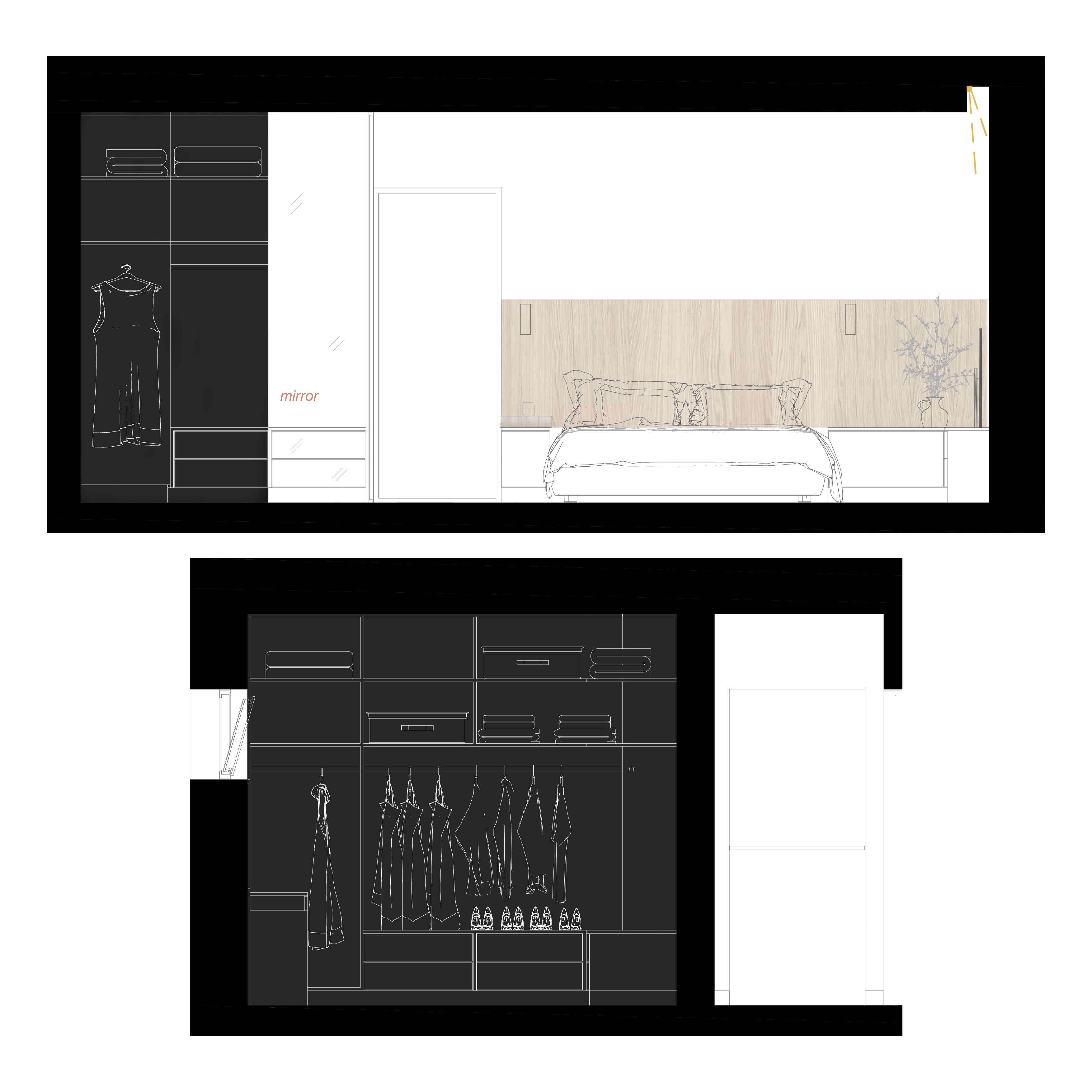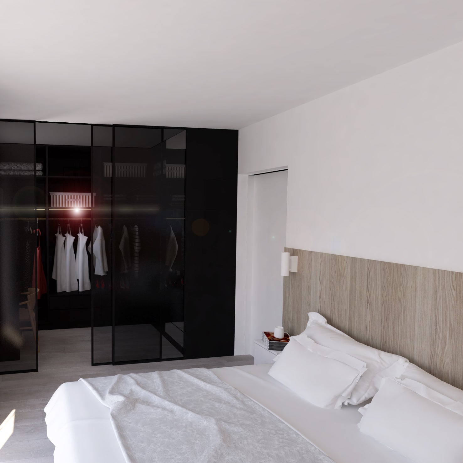 Sections showing the entire bedroom with a walk-in closet. Light tones of the bedroom are contrasted with dark, black tones of the walk-in closet. Dark tinted glass separates the two.
