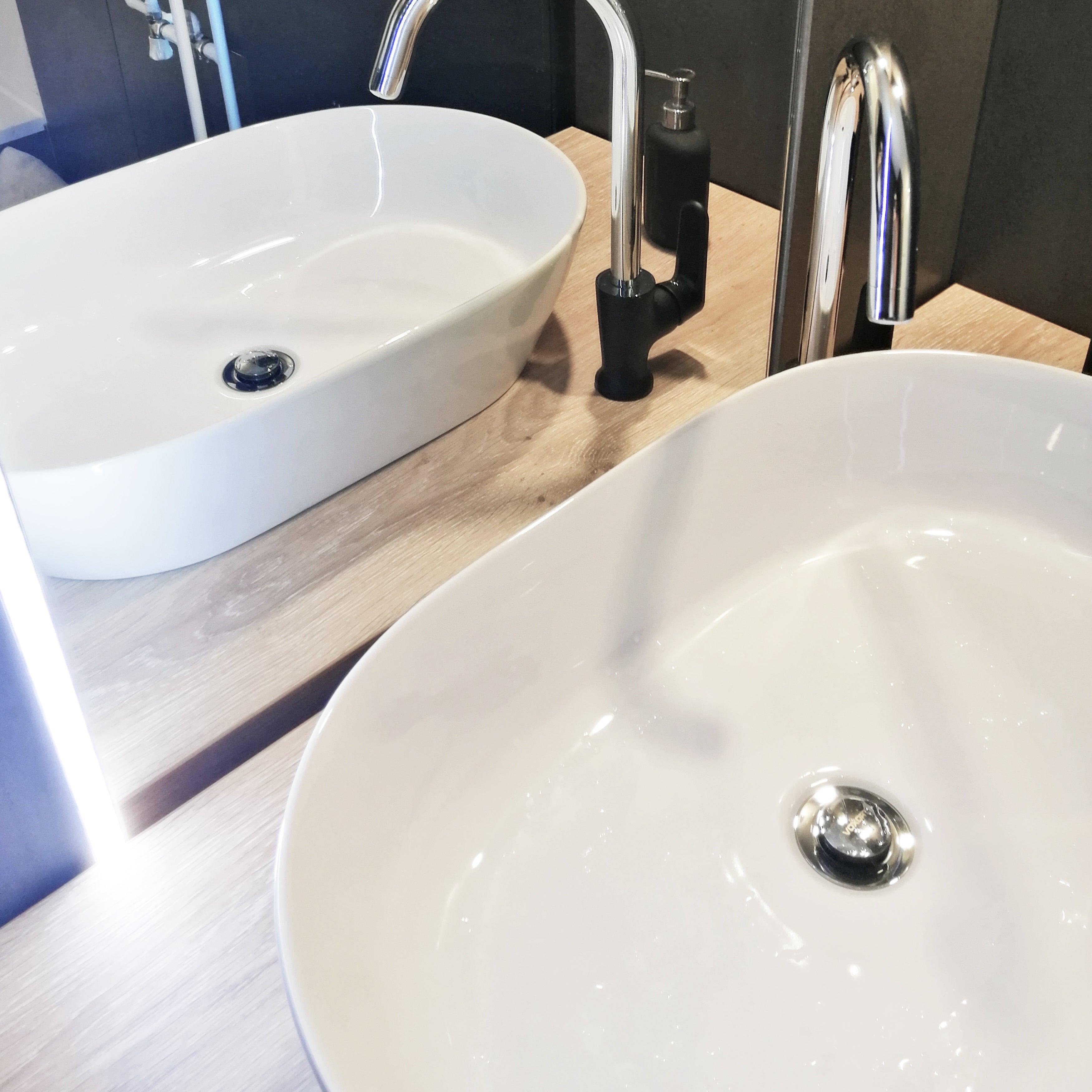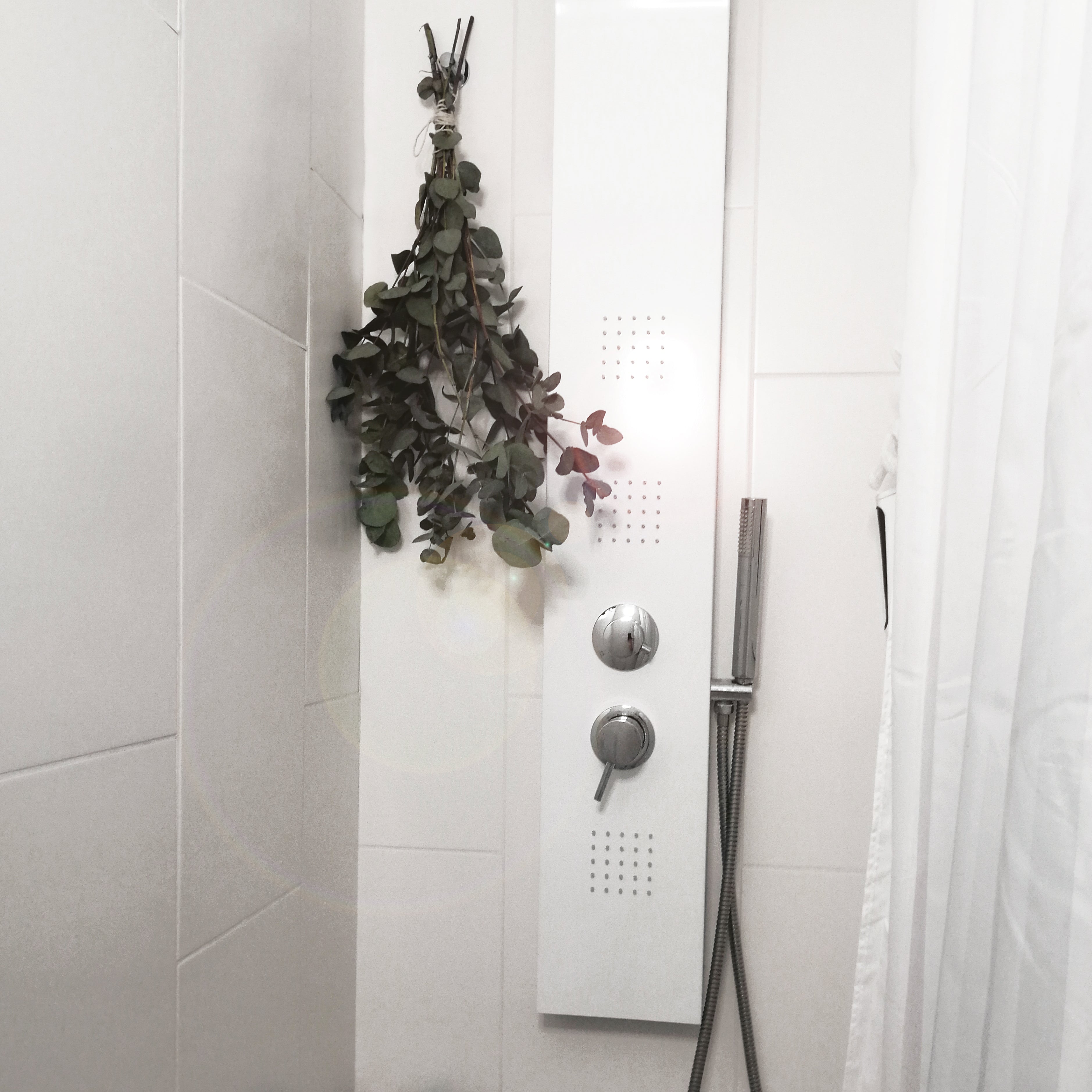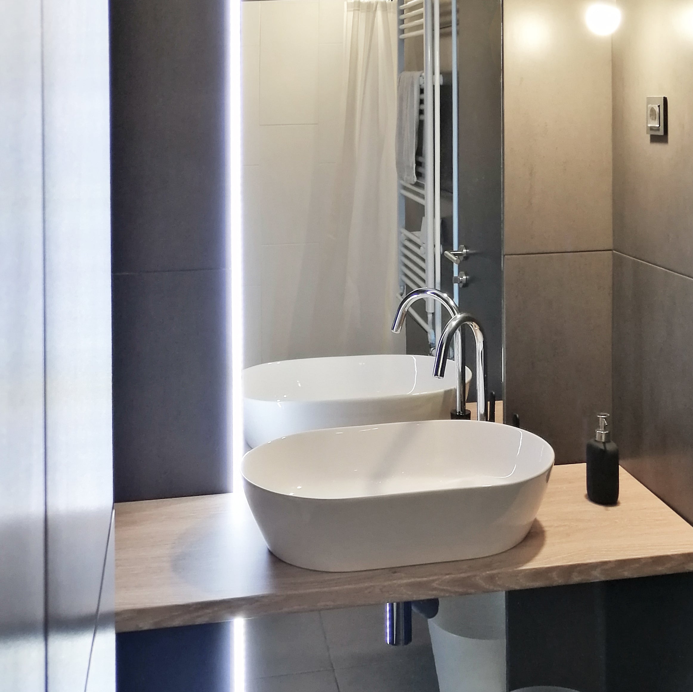 The bathroom in this project has two zones, the dark, with deep dark grey tiles, and the white inside of the shower.