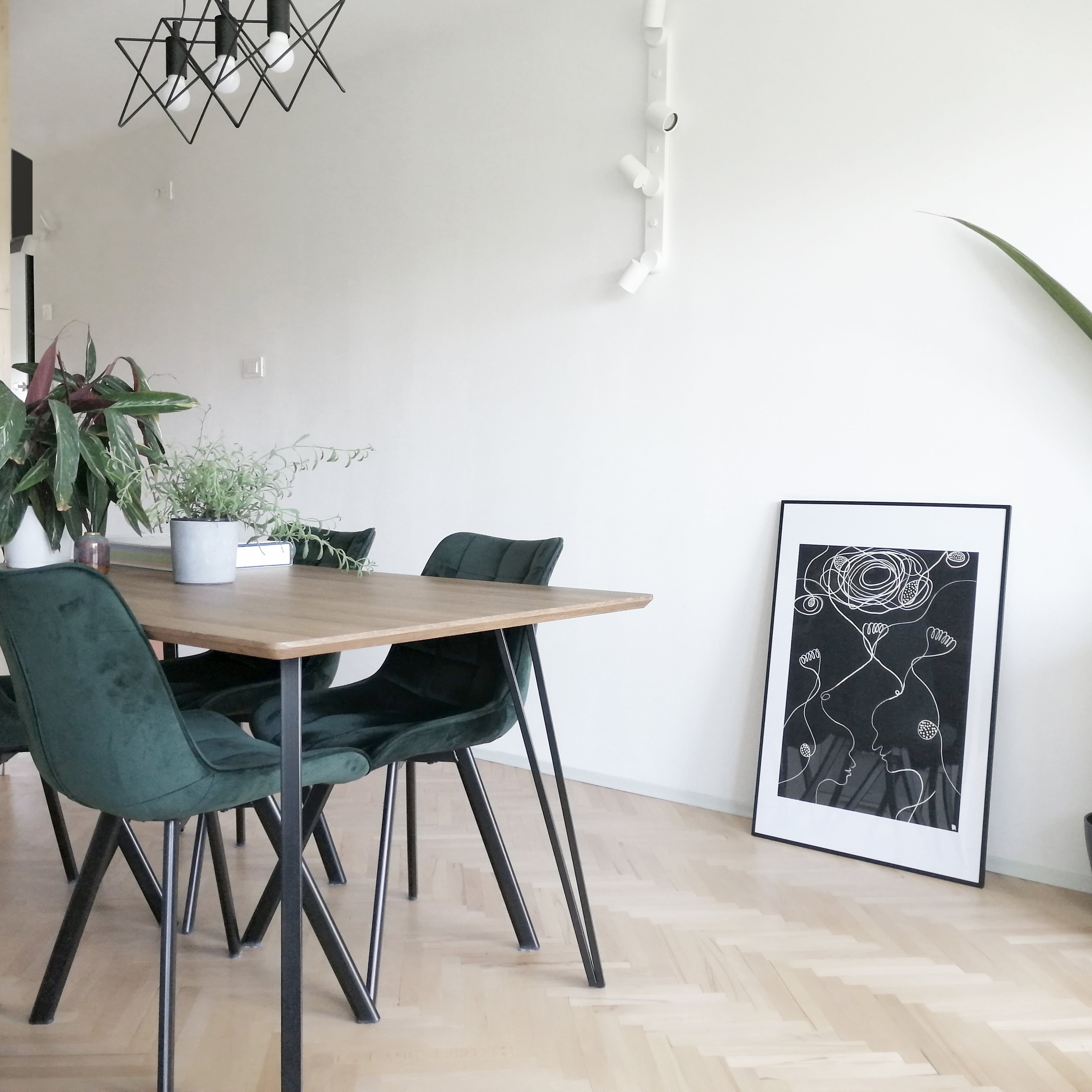Black continues through the dining table. Chairs are in green tones, following only other colors added: natural plant colors.