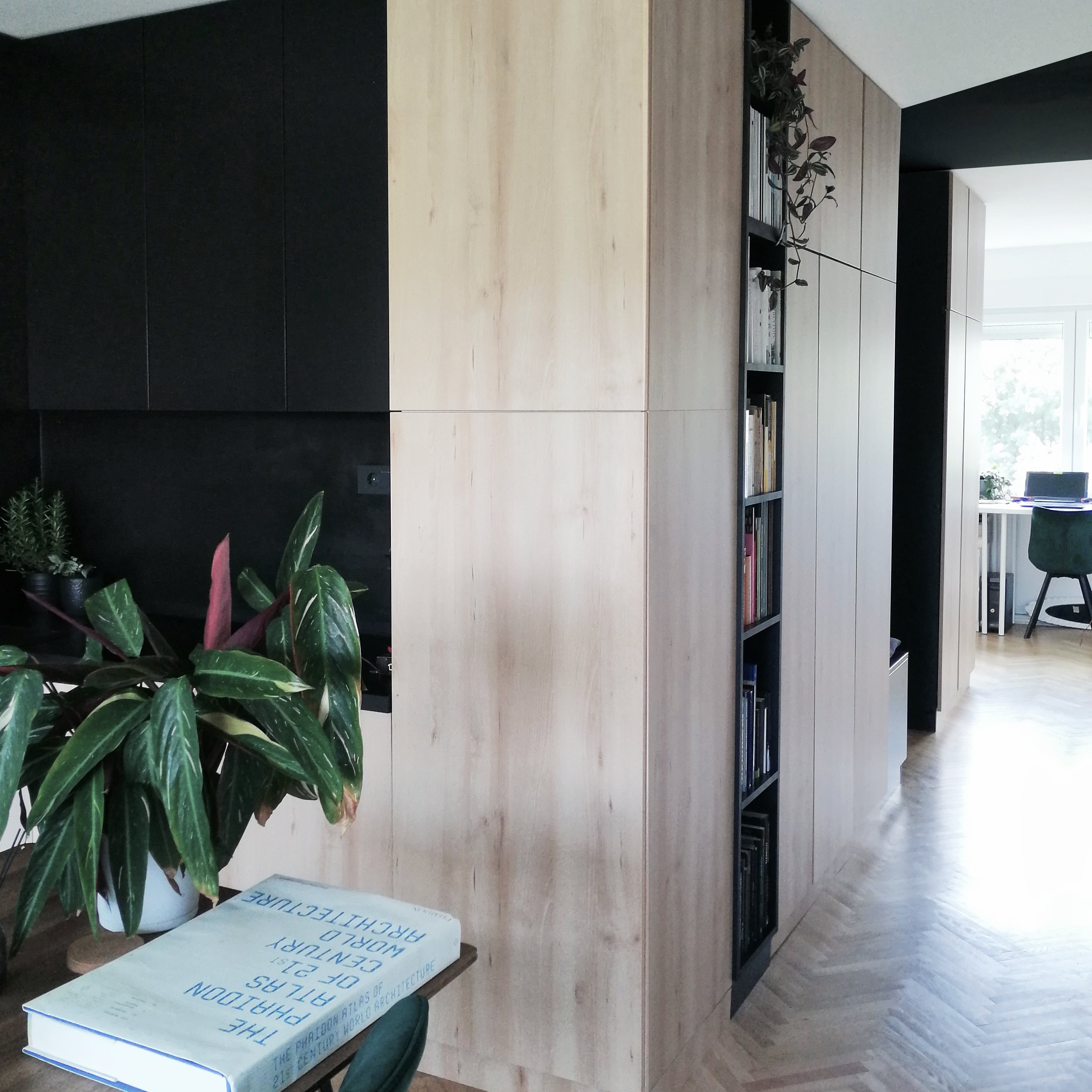 Finished built-ins and connections, both visual and physical, from one end to another. The apartment is filled with light. The black open shelving creates a break in the continuous wood surface.