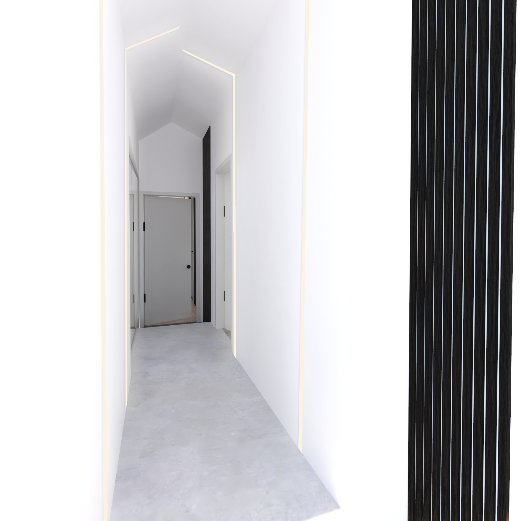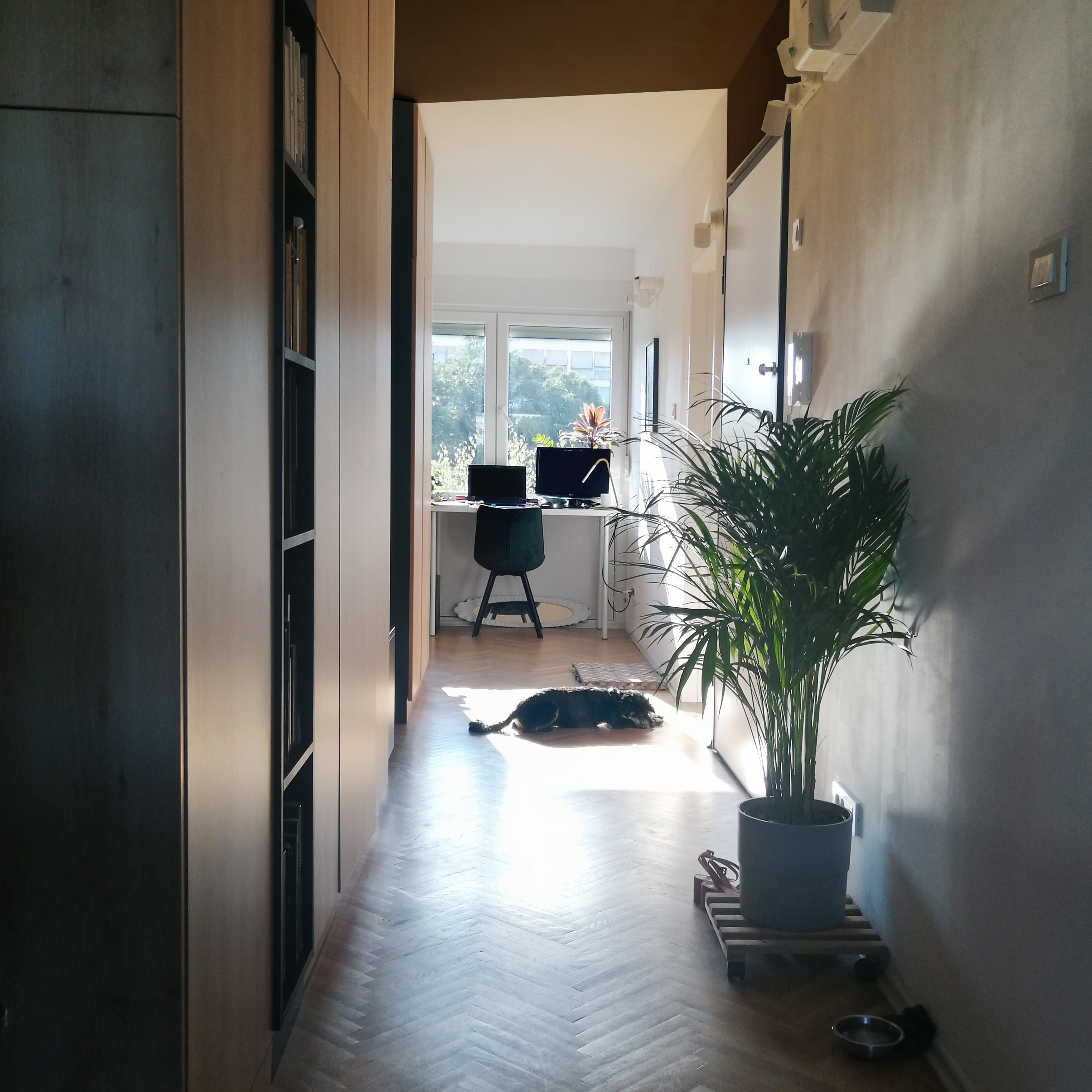 The hallway in this multilevel apartment has two sides, one leading towards the bedrooms, and the other towards the office and main areas of the apartment: kitchen, dining, and living. This side is the bedroom side of the hallway.