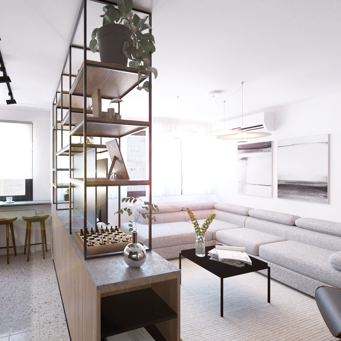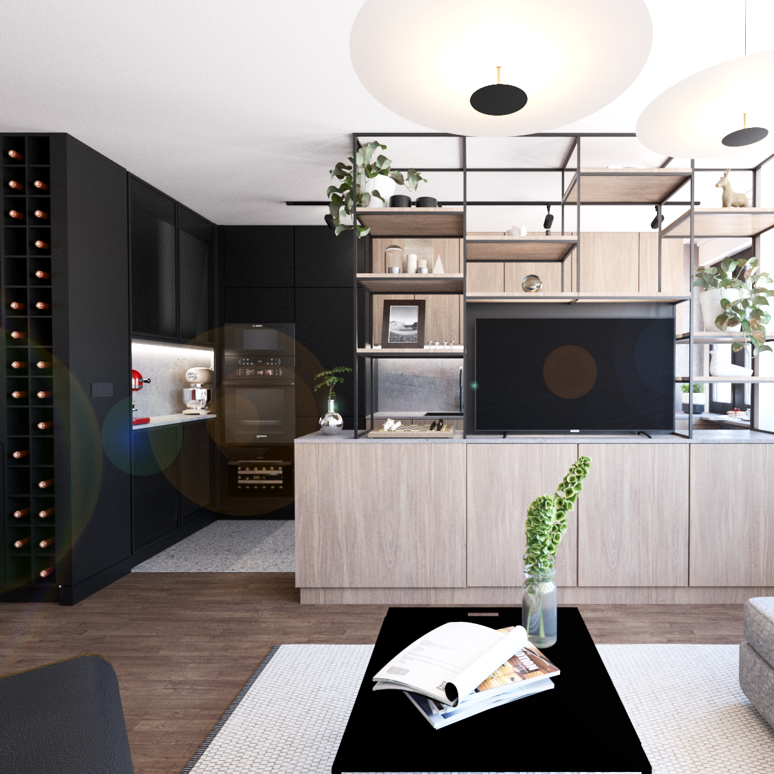 The living room design embraces a modern, refined industrial aesthetic with an open shelving system dividing the kitchen and seating areas. Black accents, light wood cabinetry, and plant elements create a perfect balance.