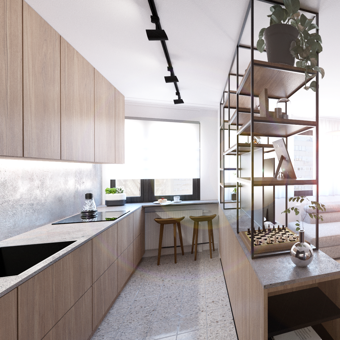 A refined warm kitchen featuring light wood cabinetry and terrazzo flooring. The open shelving and sleek black lighting fixtures add an elevated touch to the minimalist interpretation of industrial aesthetic.