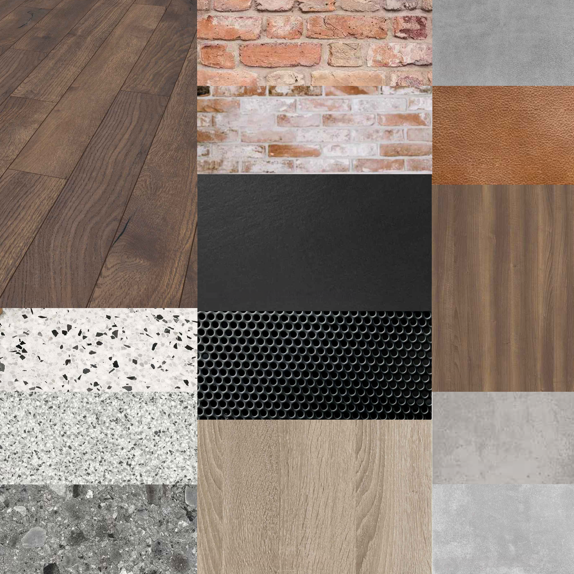 A material board highlighting the palette for SG Apartment. A mix of warm wood, concrete, exposed brick, and metal, combined with terrazzo and matte black accents, creates a sophisticated yet industrial feel.
